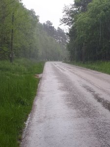 Terwijl ik zo verder stapte schoven dikke wolken voor de zon. En daar gingen de sluizen open. Niet zo leuk, want op die smalle drukke wegen moet je telkens opnieuw in de berm springen als een tegenligger komt en Al snel zijn schoenen en broekspijpen kloddernat.