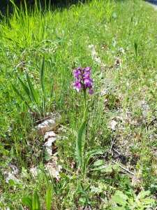 En nog in de graskant, dit orchideetje, zo eentje zoals er gisteren honderden in de weiden stonden. Terwijl ik deze foto trok, reed een oude bestelwagen voorbij naar een wat verder gelegen huisje. In de auto herkende ik de vijfvingerige bladen van het plantje dat je zelf mag telen om te roken. Over roken gesproken. Dat roken speelde vroeger ook een rol en tabak werd zelf gekweekt en gedroogd