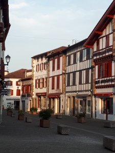 De rest van de wandeling was een lange afdaling richting Espelette. Er was wel nog een venijnig staartje, vooraleer het dorp binnen te stappen. Een leuk dorp, gekend voor les piments en nog een reeks culinaire specialiteiten. Mooie gekleurde huizen vormen er een mooi centrum.  Rond etenstijd werd het wel wat toeristisch, maar dat betekende dat je er makkelijk eten vond, leuk meegenomen voor een vermoeide pelgrim.