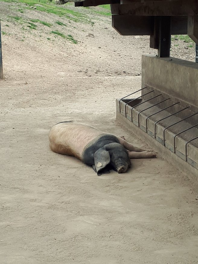 Deze foto werd op de top van de heuvel genomen. De paarden zelf lopen vrij rond maar zijn vrij mak. Wat verderop een ontmoeting met andere beestjes. Varkens, ook rondlopend op een wei. Dit exemplaar was er heel moe van.