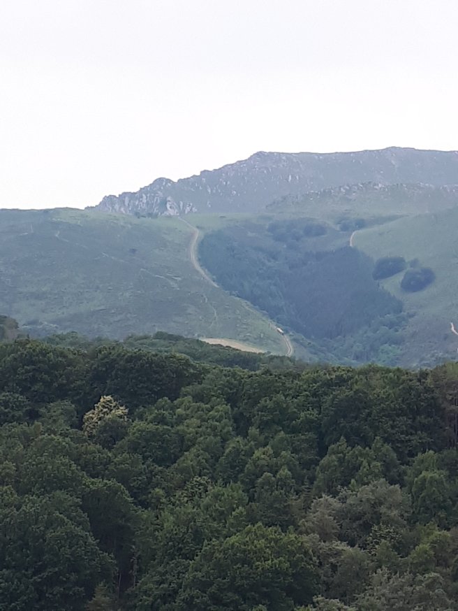En die Camino Bidasoa loopt verder richting een heuvelkam waarover ik deze voormiddag zal lopen. De weg erheen is een flinke klim, maar eenmaal boven is er weinig niveauverschil en loopt het vrij vlot. Rechts van het pad vallen de kruinen van vele tamme kastanjebomen op. Er zijn er hier massa’s van, van deze tamme kastanjebomen.