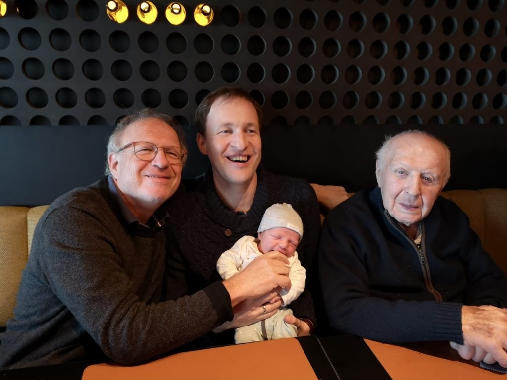 Hiep hiep hoera – een derde kleinkindje is geboren! Philip is de naam en meteen is dat de kleinzoon die een viergeslacht mogelijk maakt in puur mannelijke lijn. Van links naar rechts: ikzelf, zoon Koen, kleinzoon Philip en pappie (90 jarige) Gustave De Jonckheere, mijn vader. Iedereen zo fier als een gieter!