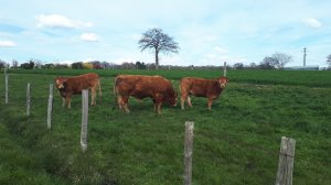 Nog een laatste blik op de donjon en het stadje wandelde ik terug naar boven, naar de velden en vooral de uitgestrekte weiden waar er terig wat bruine koeien vetschenen. De kleur van de weiden was wel opvallend.