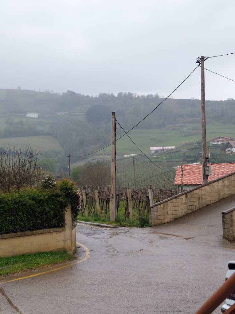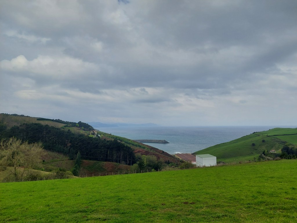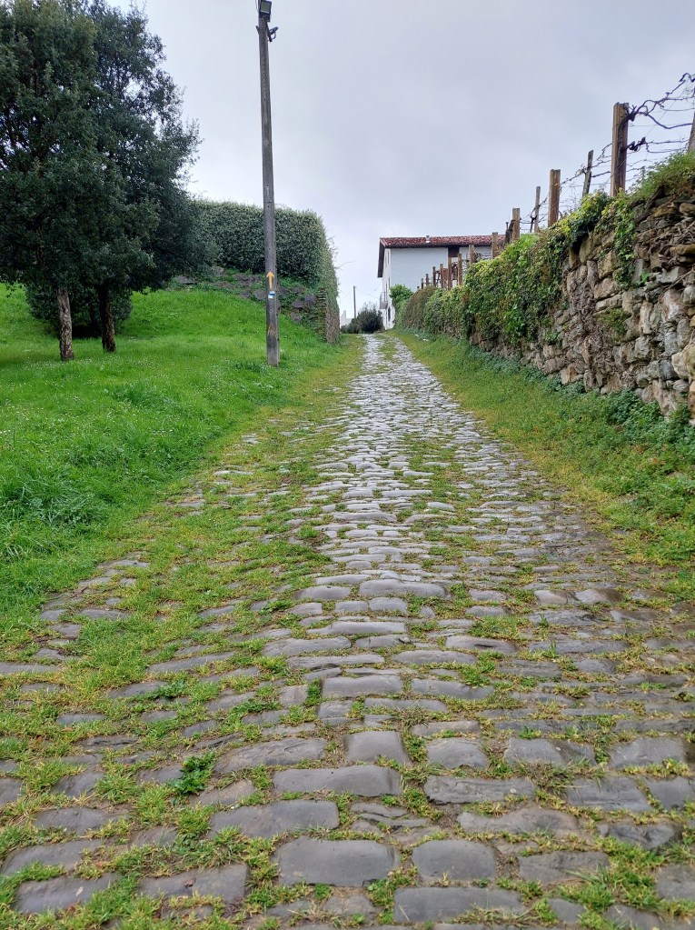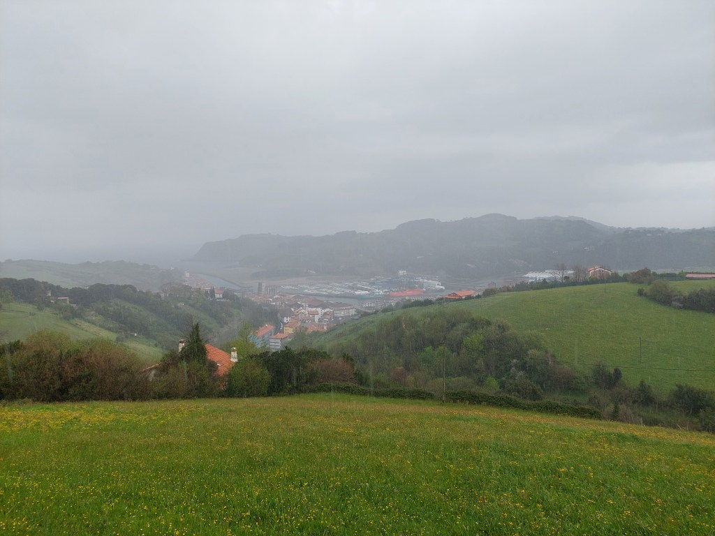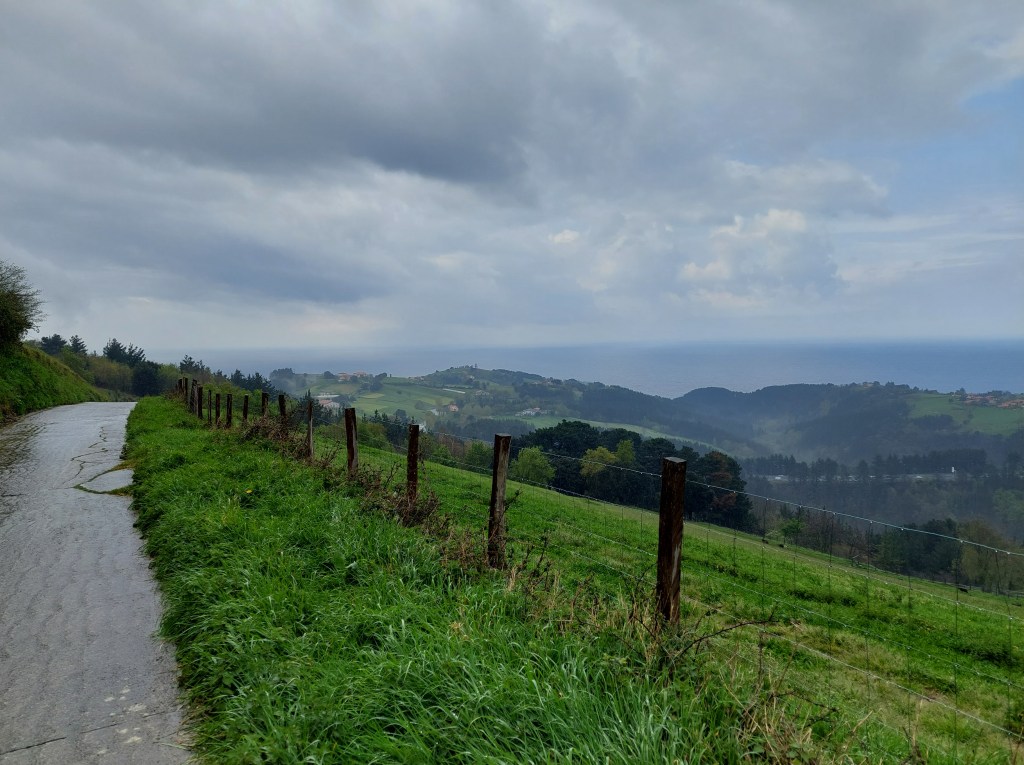 Dus met goede moed vertrokken na het ontbijt, waar de uitbaatster me nog snel een hap mee gaf voor onderweg. De weg ligt nat en het wordt weer wat zoeken hoe de schoenen het doen op natte stenen. Ik heb echt geen zin om te vallen. Meteen de proef op de som bij het verlaten van Deba.