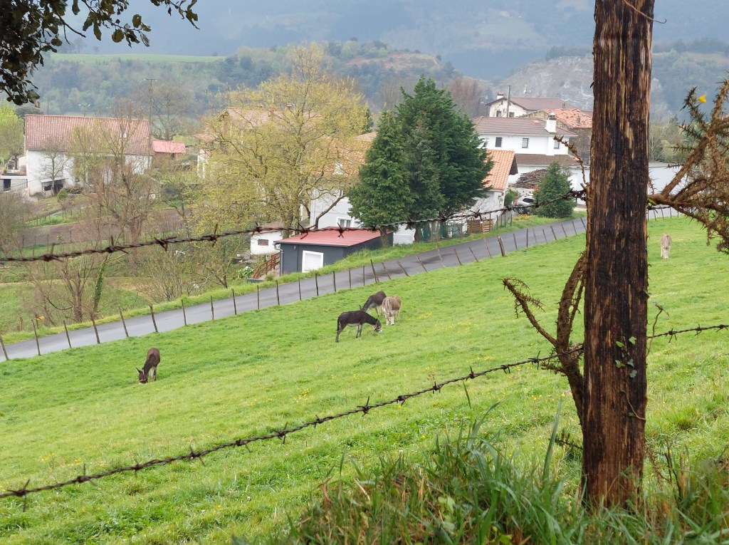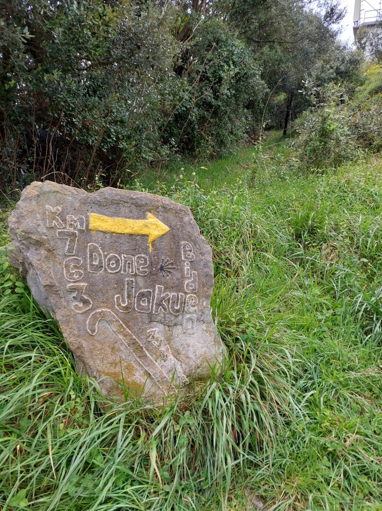 Deze namiddag hebben de pelgrims geluk te kunnen stappen langs mooie asfaltwegen. Dat maakt het modderploegen voorlopig wat minder en ga je wat sneller. Je leert mensen kennen onderweg. Je wordt ingehaald of je haalt de andere terug in en af en toe een korte babbel. Zoals met die oudere Franse dame die zei dat ze voortging als de slak. “Ik ben 2 dagen geleden gevallen en heb last van mijn knie en schouder. Maar dat geeft niet mijn compagnon loopt op eigen ritme voorop. Vivement jour de repos a Bilbao.”