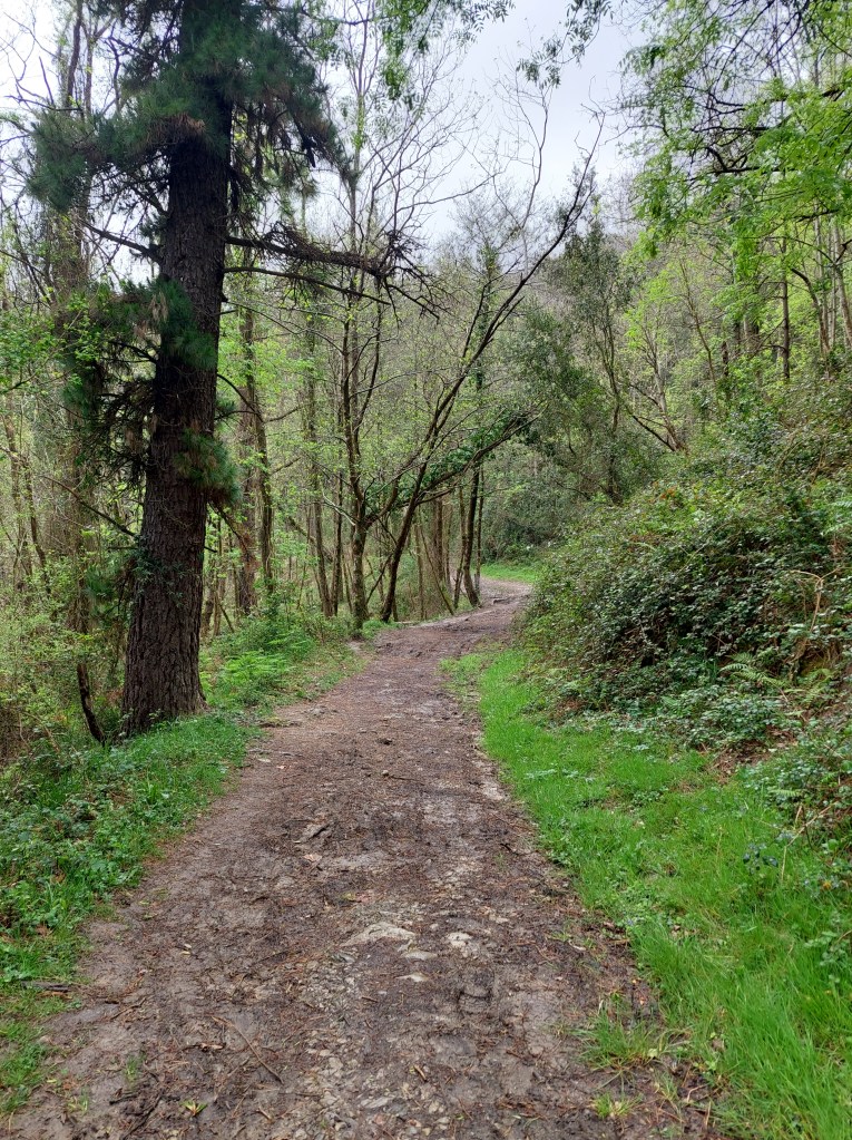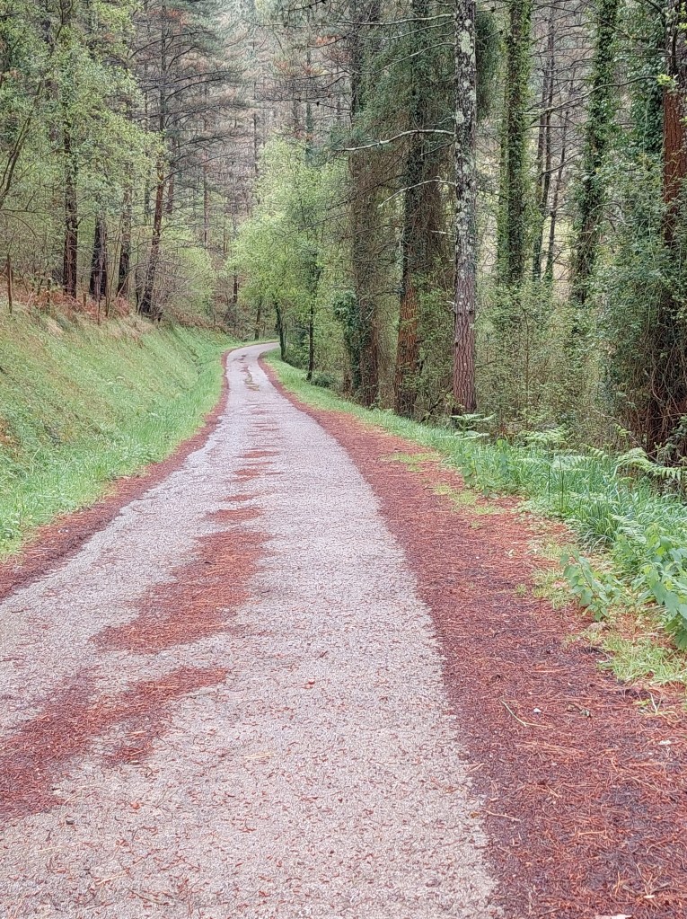 Dan gaat de officiële route nog een toer van bijna 20 km rond in de binnenlandse heuvels. Ik nam echter de hoofdweg verder. Die liep af en toe langs de autoweg ook. Dus wel wat kabaal. Ook een stukje via een paralel bospad.