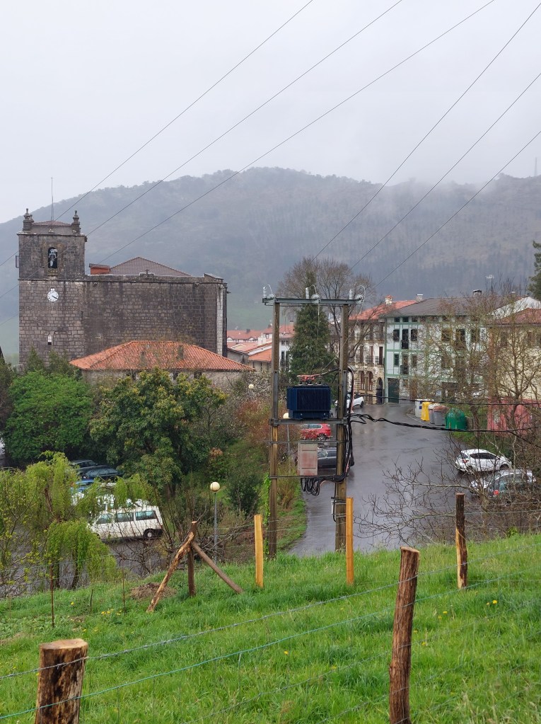 Ik hield even halt in het dorpje Marmiz om onder de overkapping daar mijn regenponcho aan te trekken en regenbroek. De sluizen gingen open en dikke korrelhagel viel neer. Wat verderop toch halt gehouden bij de Duitse pelgrims. Hij blijkt Christian te heten, gekomen met het vliegtuig naar Irun en daar aan eerste Camino begonnen. Ook Gernica op het programma vandaag. De volgende halte is , een dorpje boven de heuvel met gigantische kerk. Daar zaten weer de verschillende pelgrims uit te rusten.