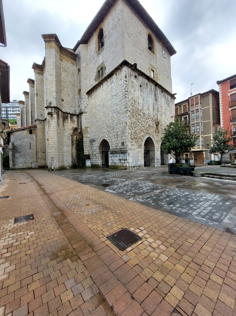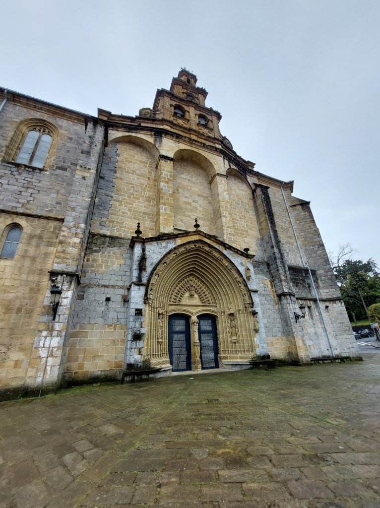 De hemelsluizen stonden weer volop open bij aankomst in Itziar. Even gaan kijken en schuilen in de mooie kerk daar.