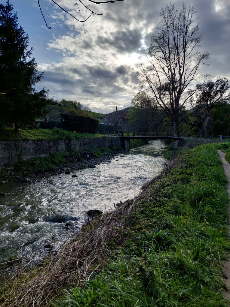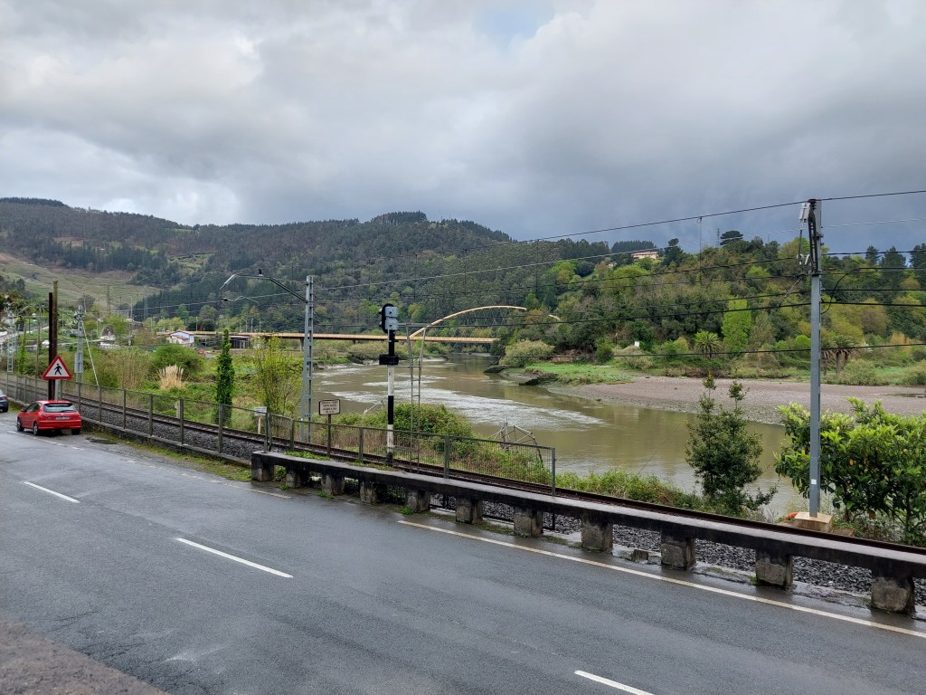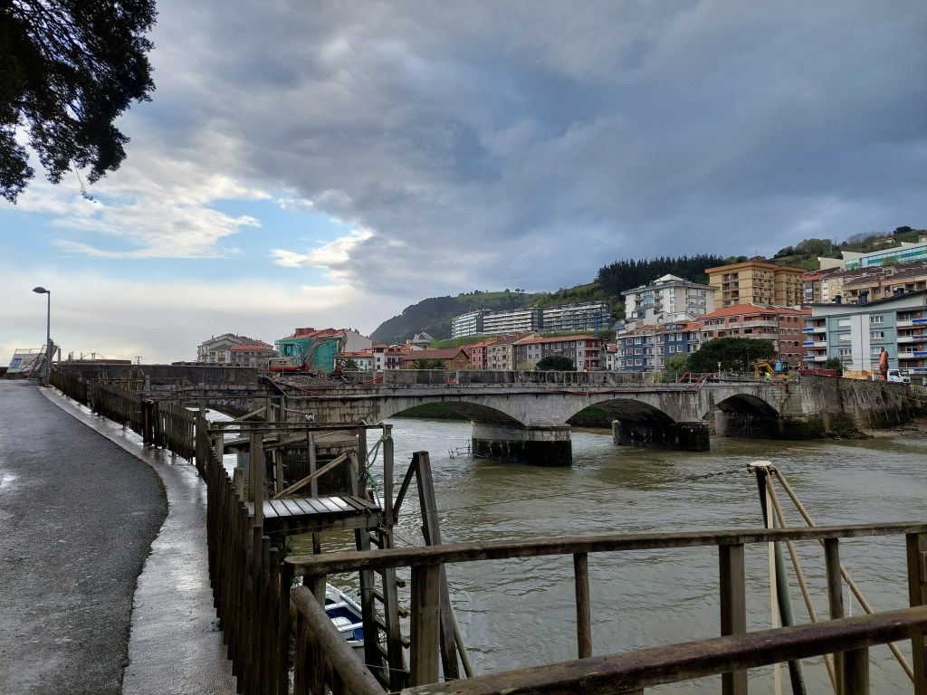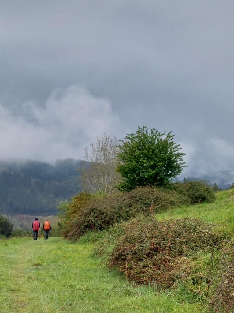 Na een 4 tal natte km gestapt te hebben daalt de camino af naar Santiago Auzoa . Een scheepswerf ligt er naast de brug die de rivier over strekt en waar de tocht over gaat. Aan de andere zijde proviand gekocht want nu begint de wandeling pas echt met omhoog en omlaag én nog meer regenbuien.