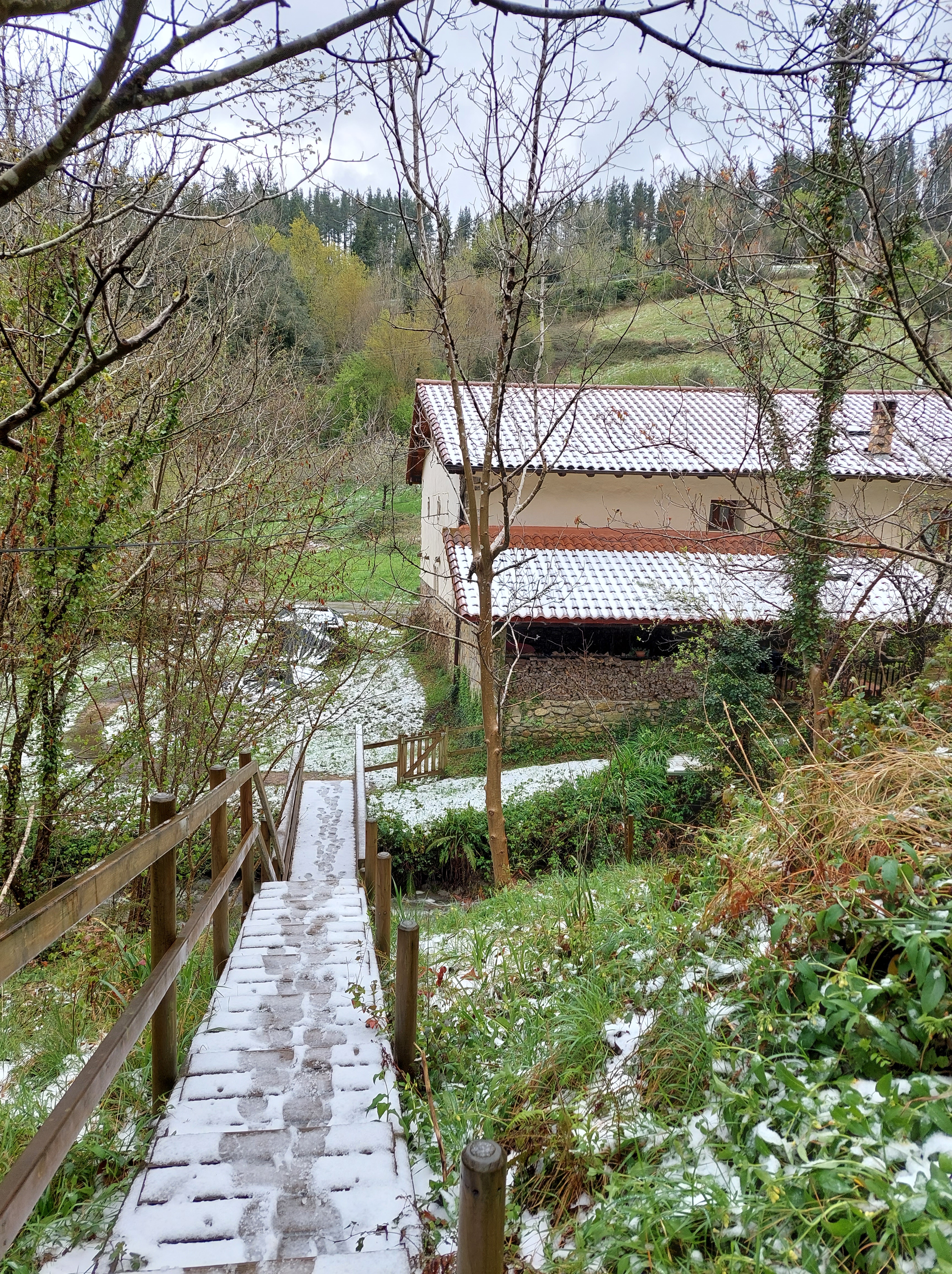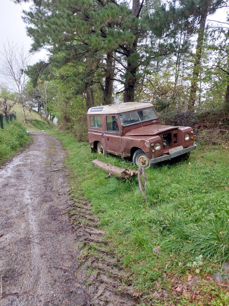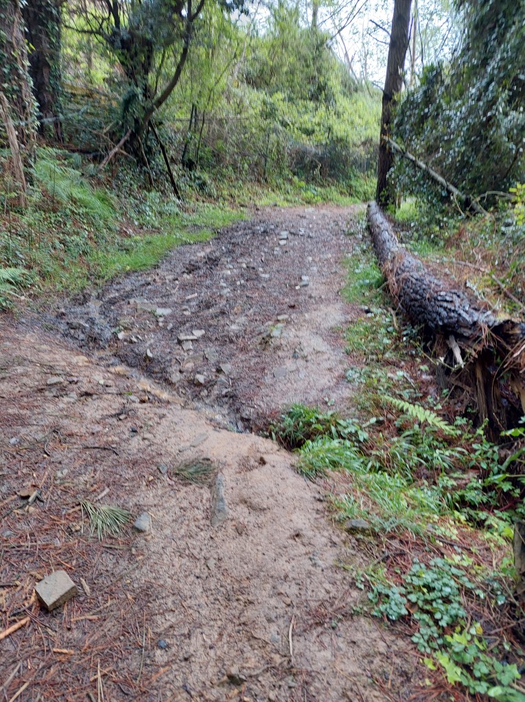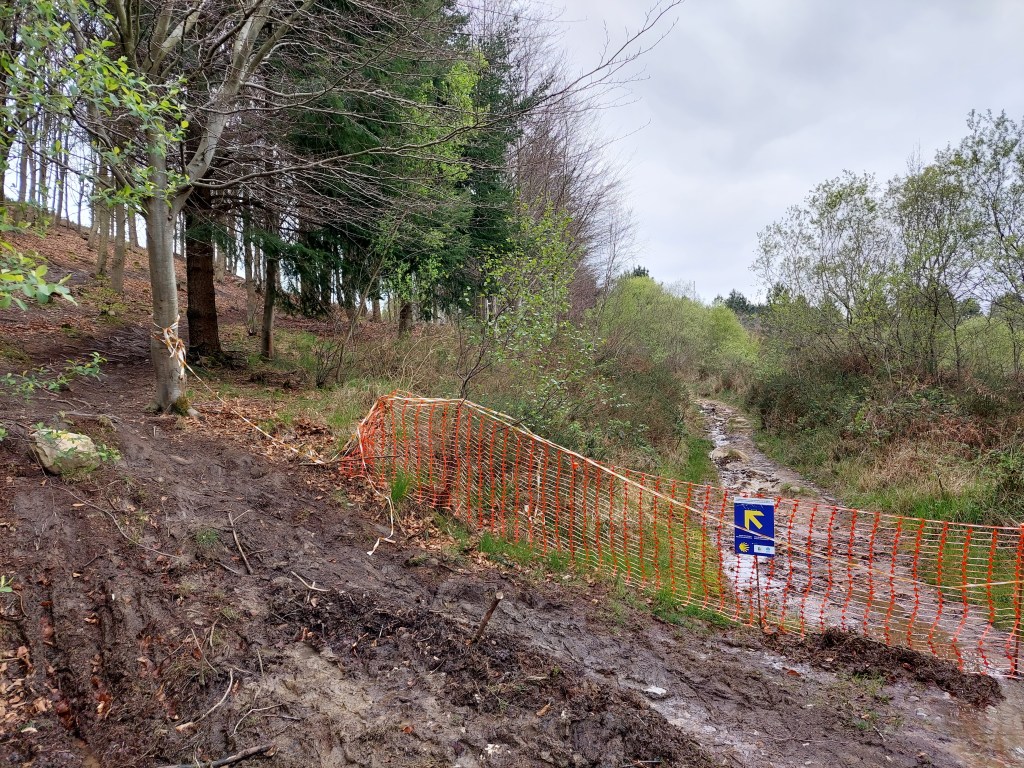 Na een 4 tal natte km gestapt te hebben daalt de camino af naar Santiago Auzoa . Een scheepswerf ligt er naast de brug die de rivier over strekt en waar de tocht over gaat. Aan de andere zijde proviand gekocht want nu begint de wandeling pas echt met omhoog en omlaag én nog meer regenbuien.