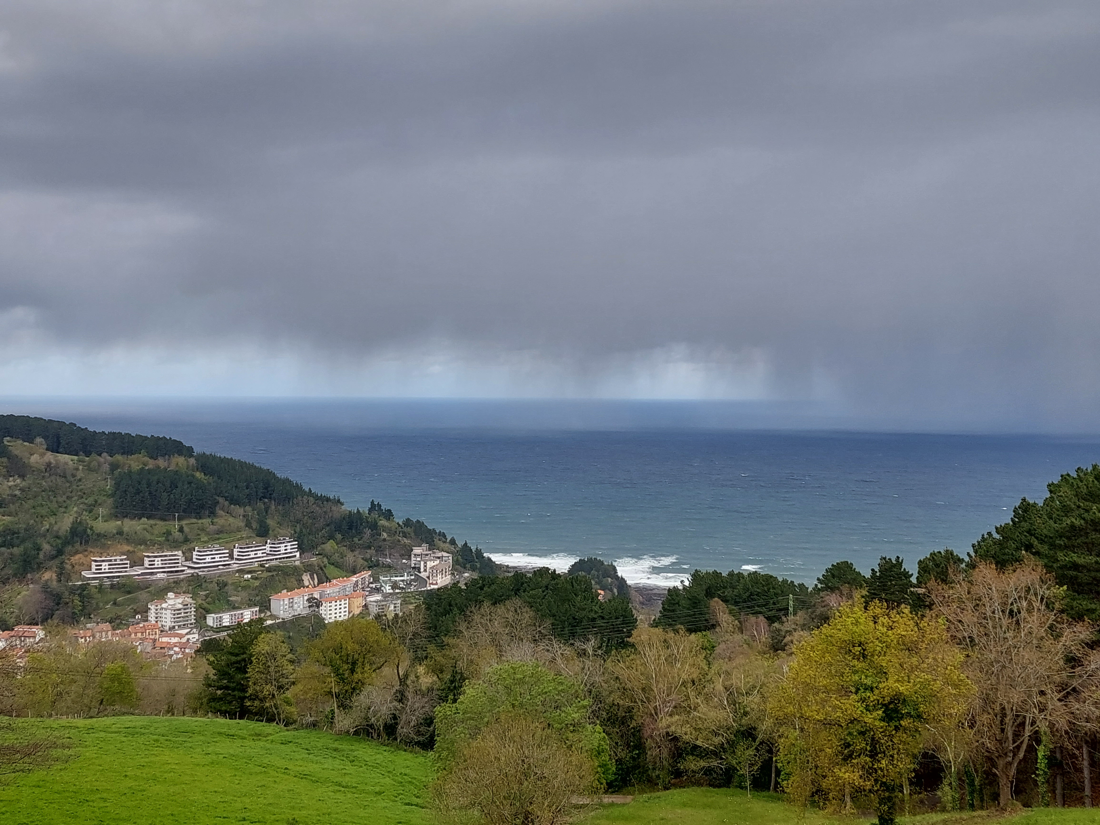 De zon ging zelfs schijnen. Dit gaf het landschap meteen kleur. Op en neer ging de route richting Mutriki. De buien nog steeds dreigend boven zee wandelde ik verder .