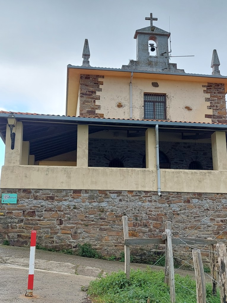 Aangekomen aan de Ermita del Calvaro begon het stevig te hagelen. Gelukkig bood het kerkje bescherming. Ik moest onwillekeurig denken aan de 3 Franse pelgrims die vanmorgen aan het ontbijt zaten. Een ervan vertrok in korte broek. Amaai, dat worden “koede kieten” in het westvlaams. Ik schuilde even en een jong koppel Franse pelgrims schuilde ook.