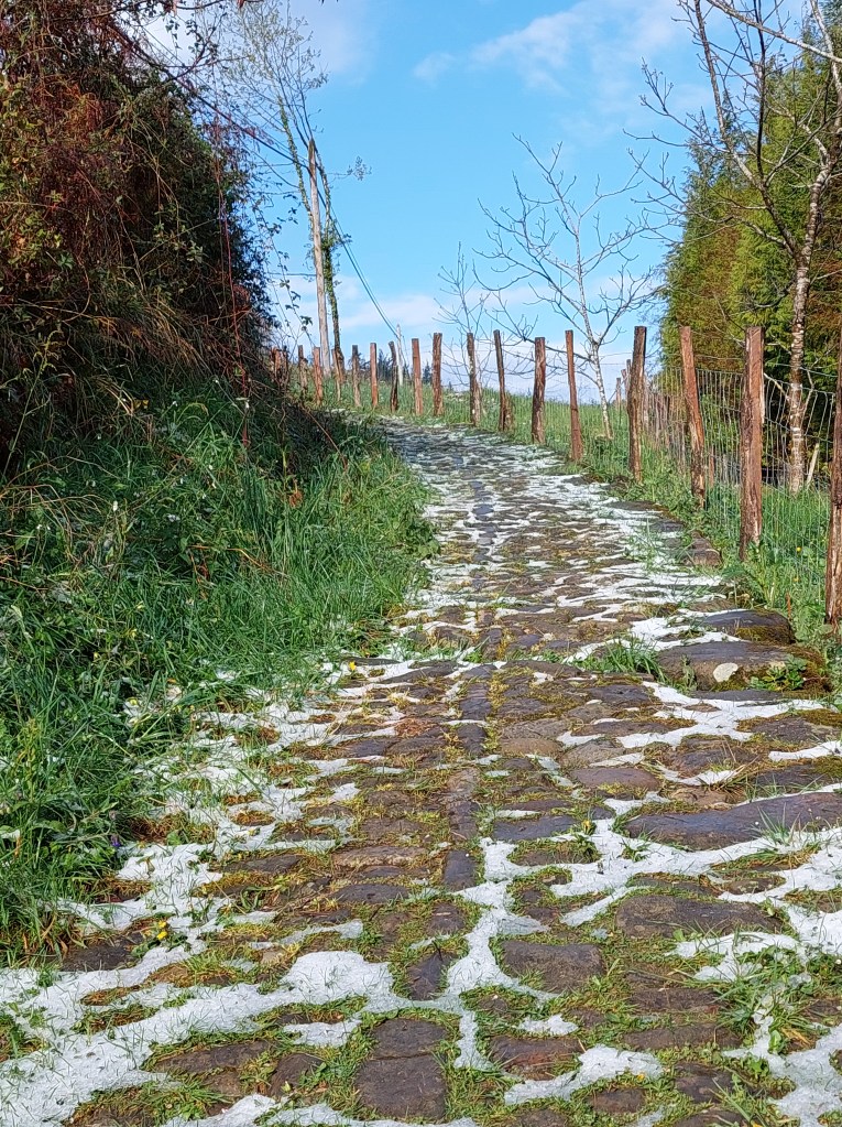 Het wordt een lange etappe vandaag. Met stijgen en een beetje dalen. Bij het vertrek eerst door een bui van korrelhagel verwelkomd. De poncho aan in de tunnel onder de spoorlijn.