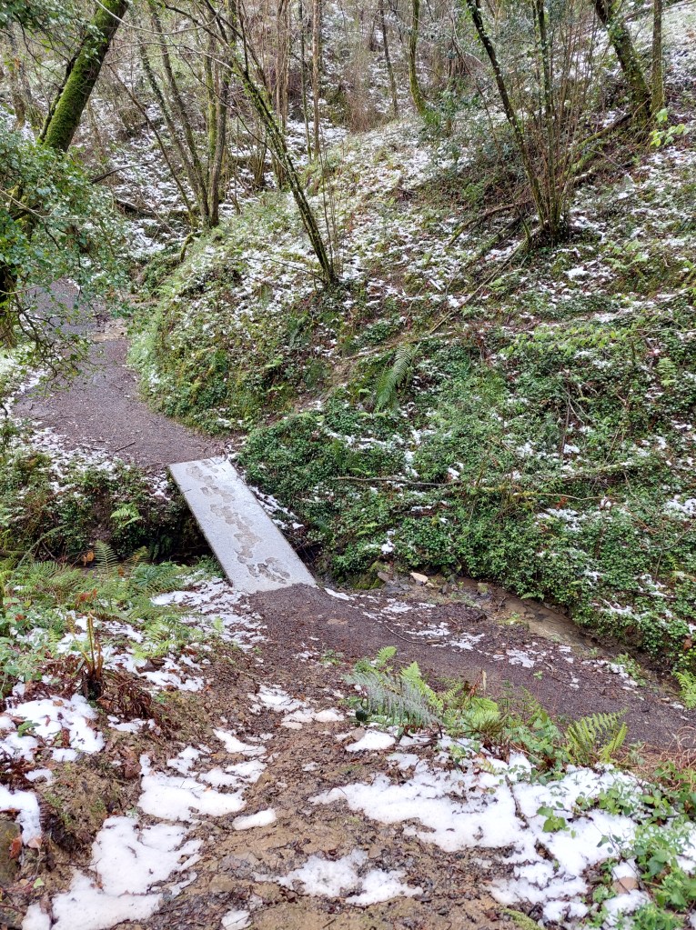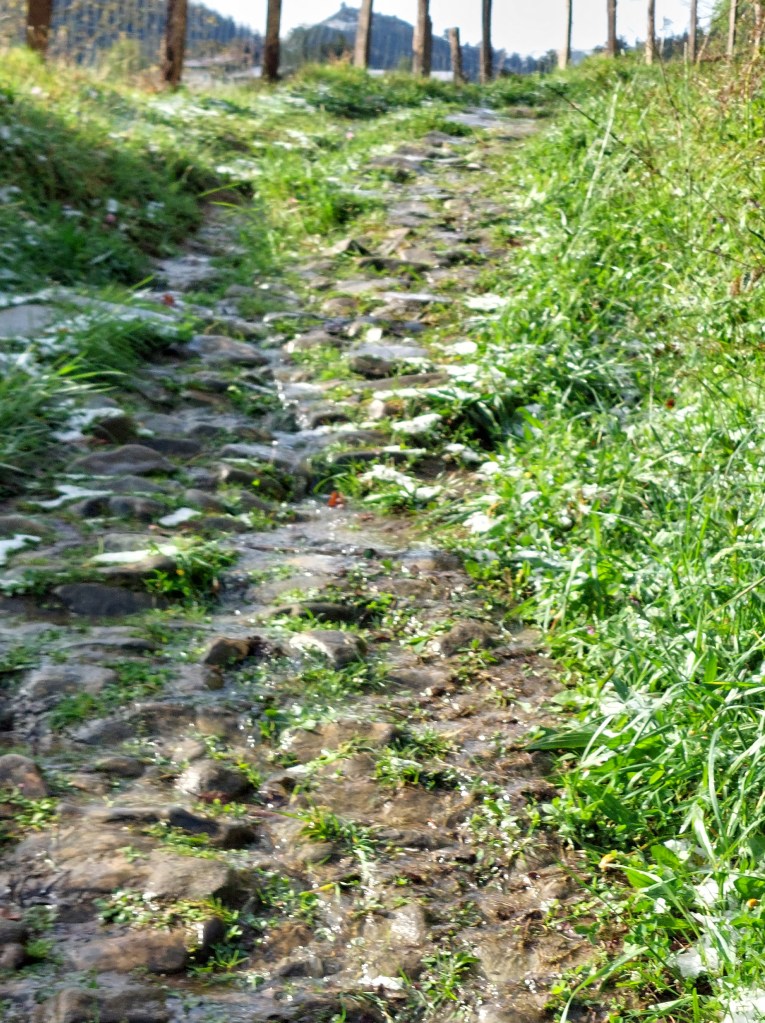 Eigenlijk ligt het gevaar eerder onder de sneeuw. De natte stenen die glad kunnen zijn. Je moet dan ook geconcentreerd kijken waar je je voeten zet op zoek naar stevige ondergrond. Een misstap kan het einde van de Camino betekenen. De weggetjes worden zelfs afvoergeulen waar flink wat water over naar beneden stroomt en je wil het toch een beetje droog houden.