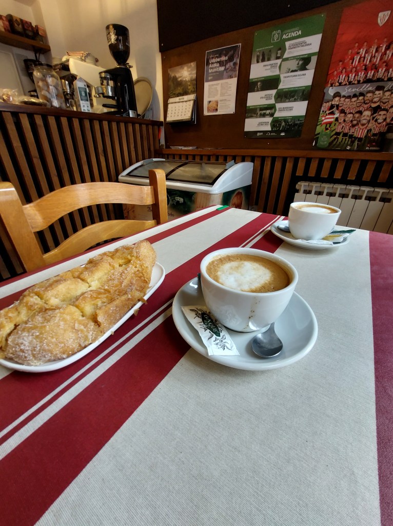 Aankomst op het pleintje van Munitibar. Een eenzame herbergier stond buiten een sigaret te roken. Tijd voor koffie en de man raadde me het kustgebak aan. Hij ging ze speciaal zelf afhalen aan zee want het gebak uit het dorp was niet zo lekker.