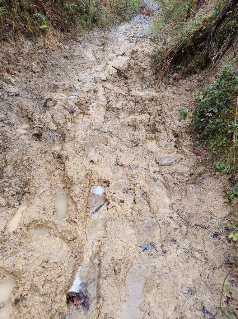 De tocht ging verder omlaag richting , het enige dorpje van betekenis vandaag. Weer heel dunbevolkt gebied vandaag! Wat was ik aangenaam verrast en blij met dit lang voldertrap en pad. Het was anders eigenlijk onmogelijk geweest die afdaling te doen door steilheid en glibberigheid.
