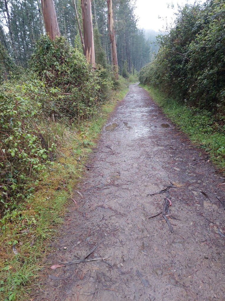 Via kleine wegen naar omhoog tussen de typische eucalyptusbomen. Toch een omweg van een 10-tal km. Na de top terug naar beneden, grotendeels via een verlaten spoorwegbedding.