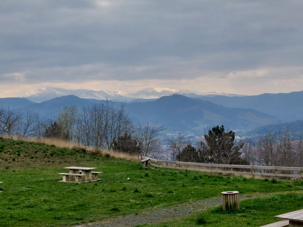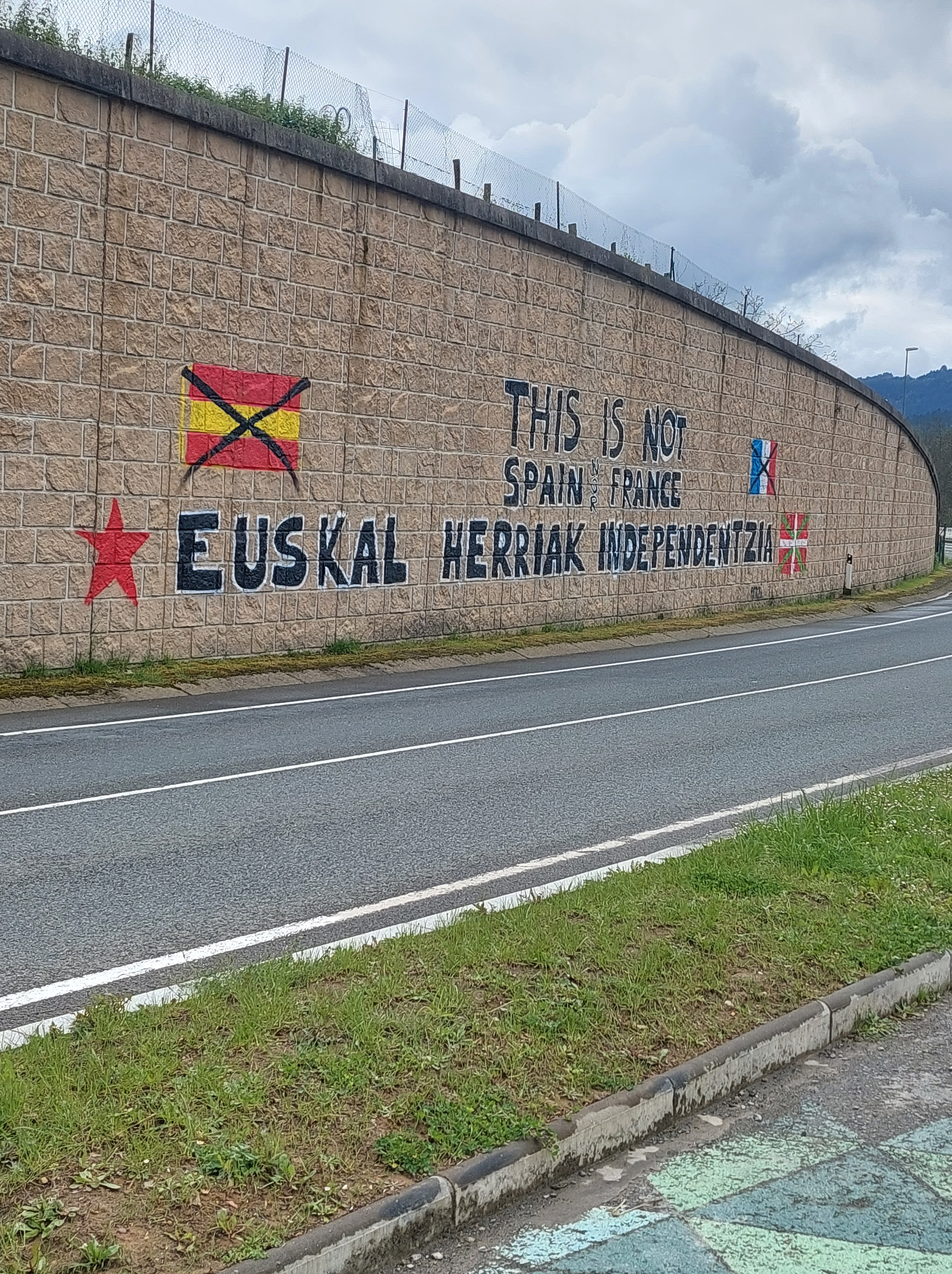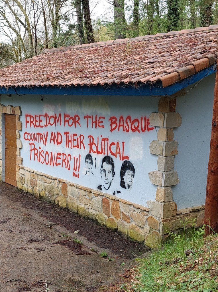 Gelukkig blijven de vergezichten mooi. Een langeafdaling richting Lezama begint. Onderweg toch sporen van hevige politieke emoties. Bepaalde Vlaamse politiekers voelden of voelen zich medestrijders. Maar zoals steeds is elke situatie uniek. Ik heb niet echt weet van Vlaamse vrijheidsstrijders in de gevangenis?