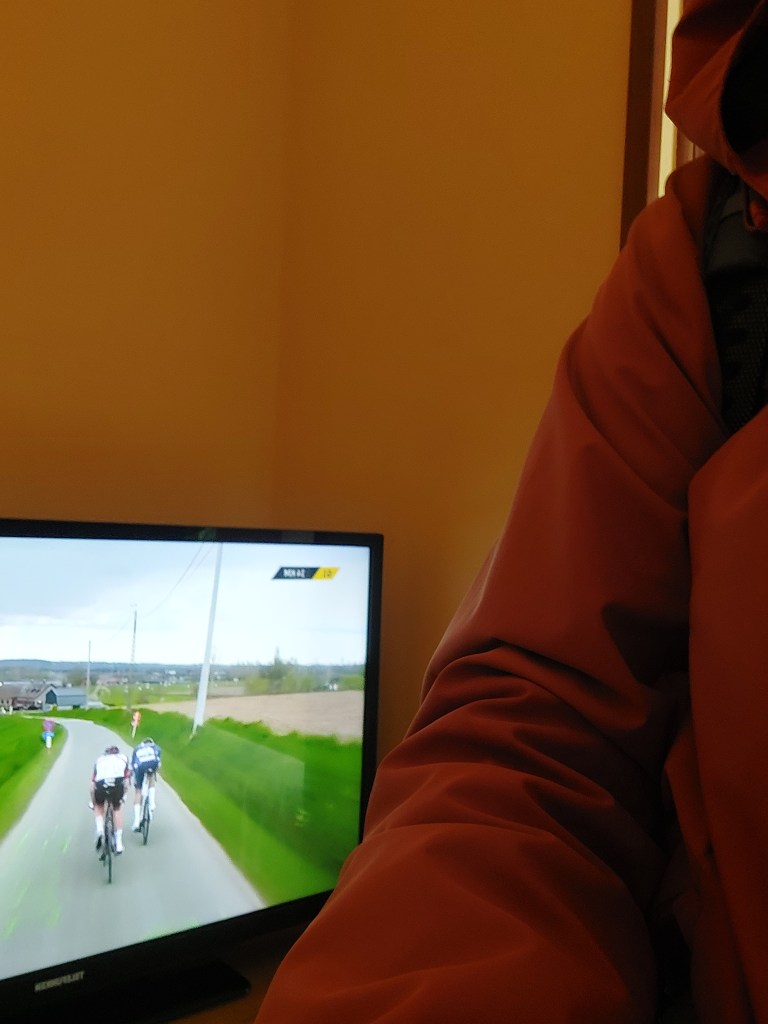 En juist op tijd op de kamer om de aankomst van de Ronde van Vlaanderen te volgen op tv.