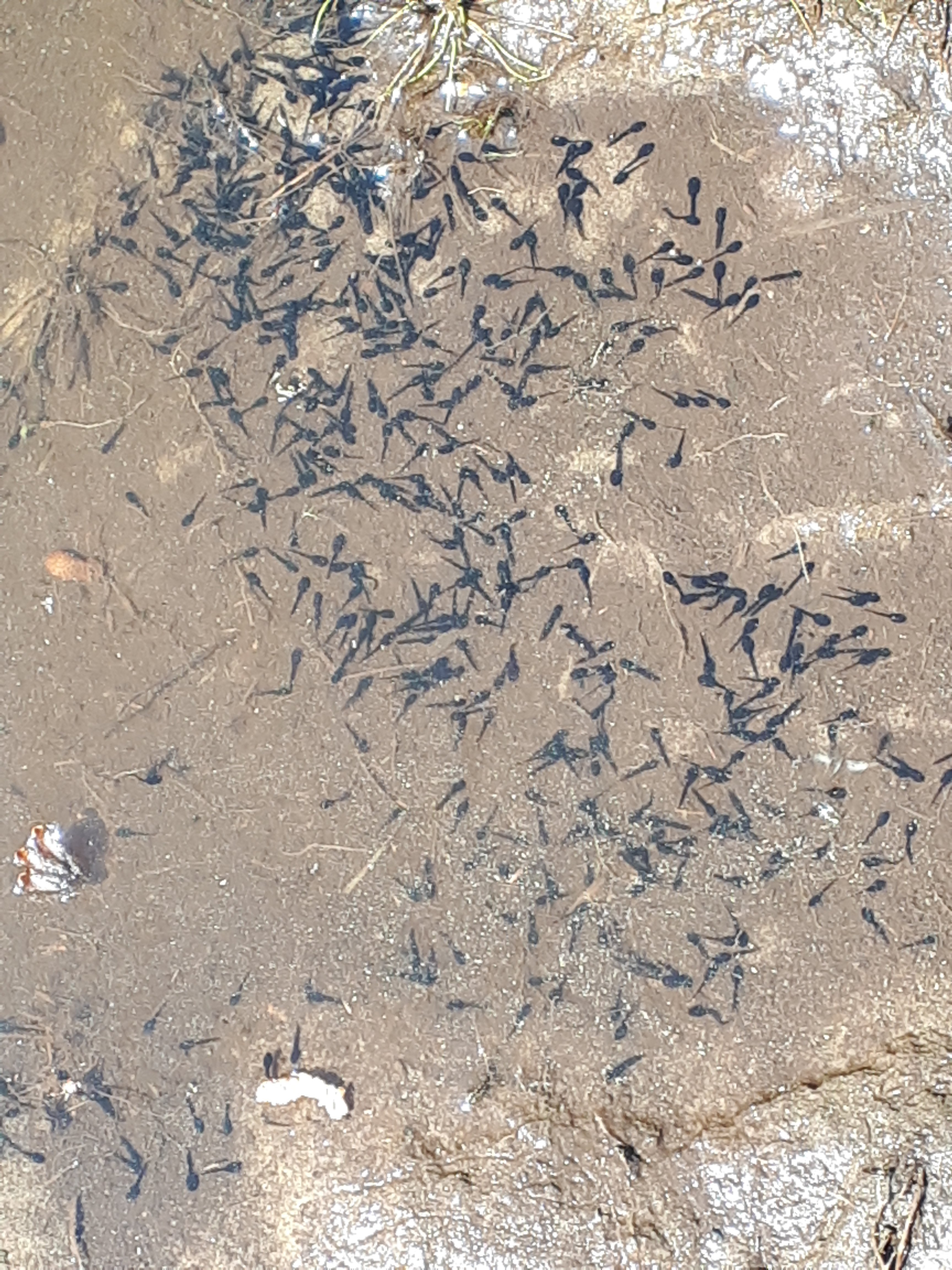 De blauwgele pijl gaf aan deze zandweg in te slaan en dat was een wandeling tussen dennebomen. Zachte zanderige ondergrond die aangenamer om stappen is dan de asfalt en wat verderop zelfs plassen met jawel, kikkervisjes in. De eerste dit jaar.