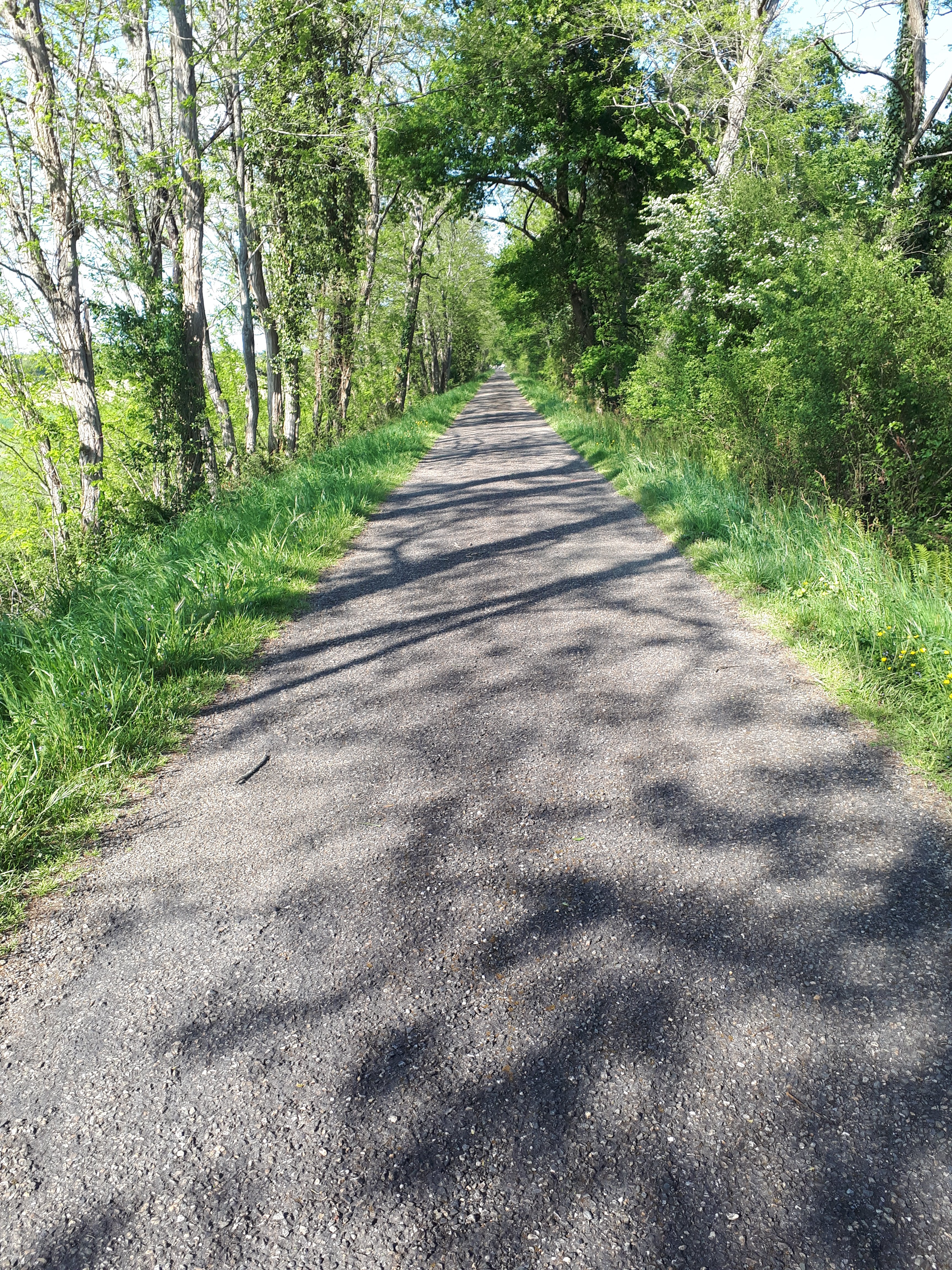 De weg ging verder naar Saint-Sever. Een flinke wandeling bovenop een pijlrechte dijk en wat verderop langs het water.