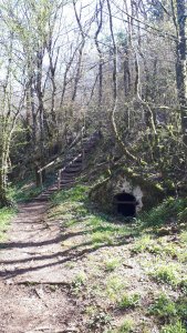 Af en toe flitste er eentje langs de rotsblokken of muurtjes. De tocht voorbij de trapjes werd helemaal anders. Heel gevarieerd met op en neer slingerende boswegels. Er was zelfs een plaatsje dat me echt deed denken aan het Elfenbad in de Efteling. Gelukkig was het droog vandaag en dus niet glibberig.