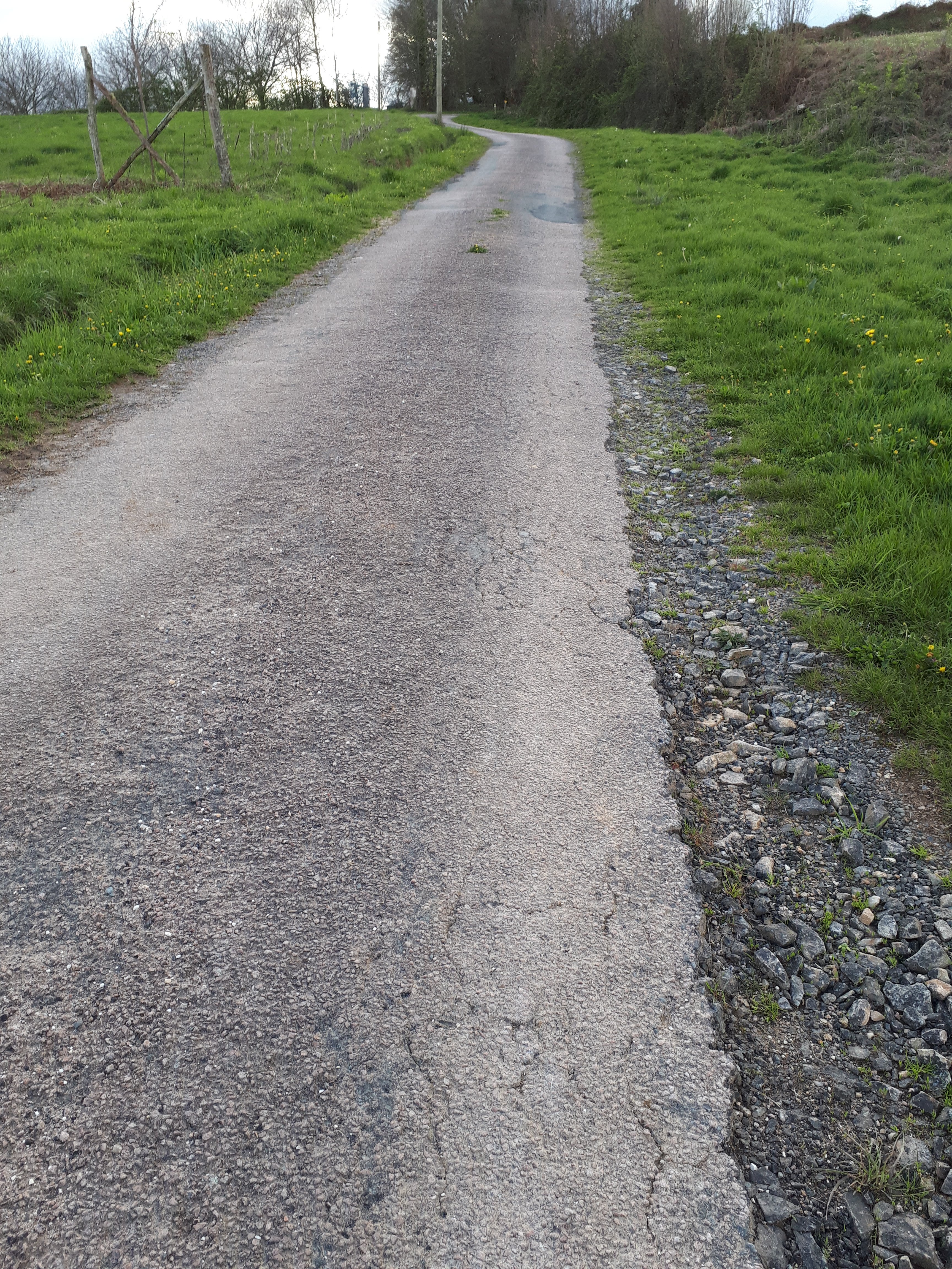Het landschap was golvend en open. Veel groen. Maar dat blijft nooit lang want plots gaat de Camino naar een rivier in een dal en na een brug gaat de tocht terug naar boven. Vaak via een al dan niet kronkelend bospaadje.