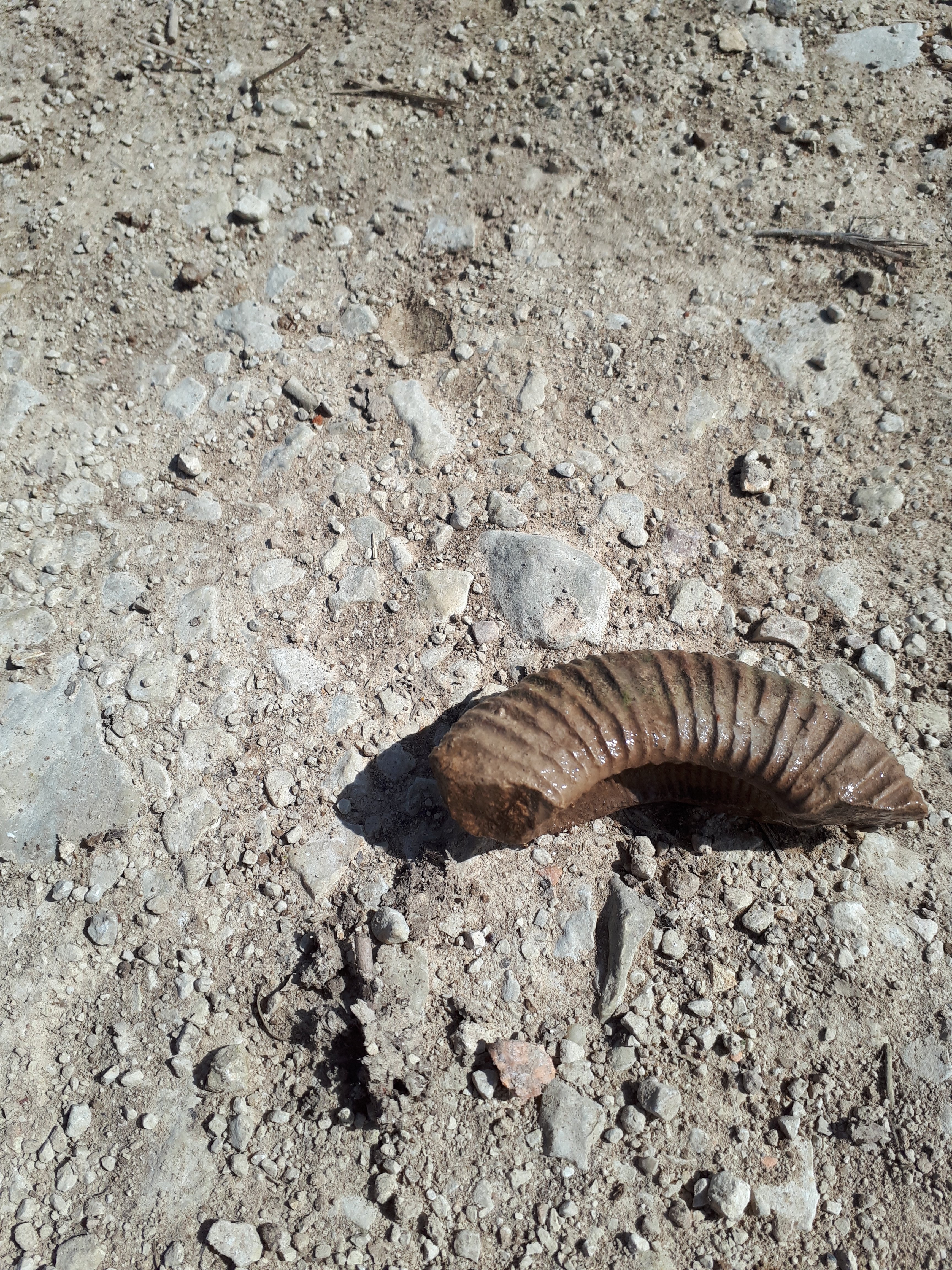 Na de stroken door het bos volgde weer stukken wandelweg door jet veld. Het was tijdens zo een stuk dat ik plots iets vreemds tussen de straatstenen zag. Met behulp van mijn zakmes kon ik het lospeuteren. Een stuk fossiel denk ik.