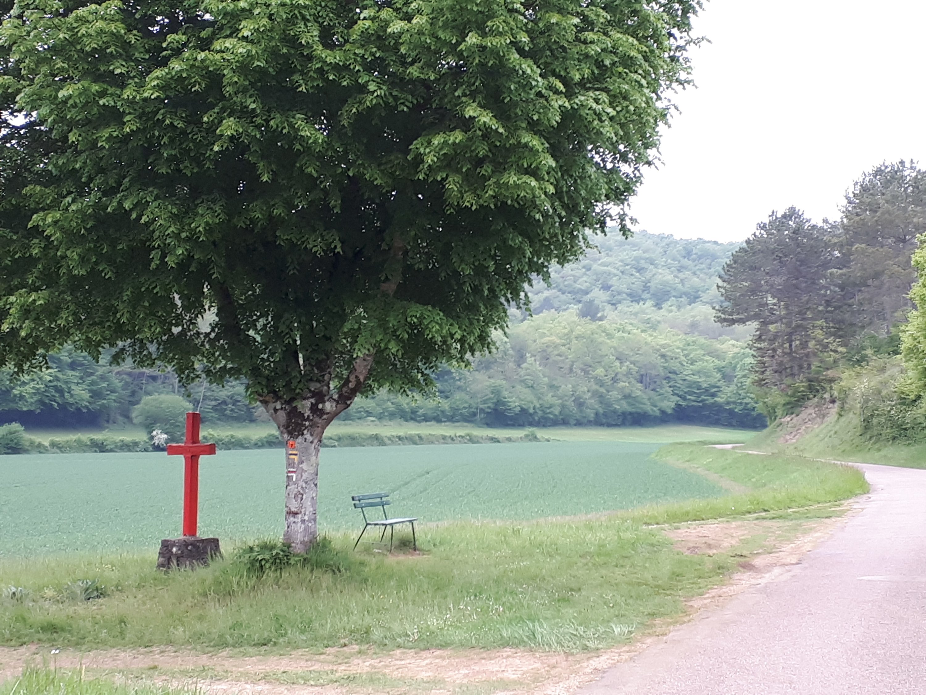 Zoals je ziet was het klimmen. Halverwege de klim stond een groot ijzeren kruis en daarnaast een 12de eeuwse kapel. Ik ging toch even piepen en werd ontvangen door 2 oudere mannen. Franciskanen bleek later. Ze zeiden dat ze aan de dienst begonnen en nodigden me uit mee te bidden. Ok. Meteen kreeg ik een brevier in de hand geduwd en na een paar gezangen werden om beurt een paar lijnen uit de psalmen voorgelezen. Mocht ik meteen ook in mijn beste Frans mee lezen. Een warme belevenis.