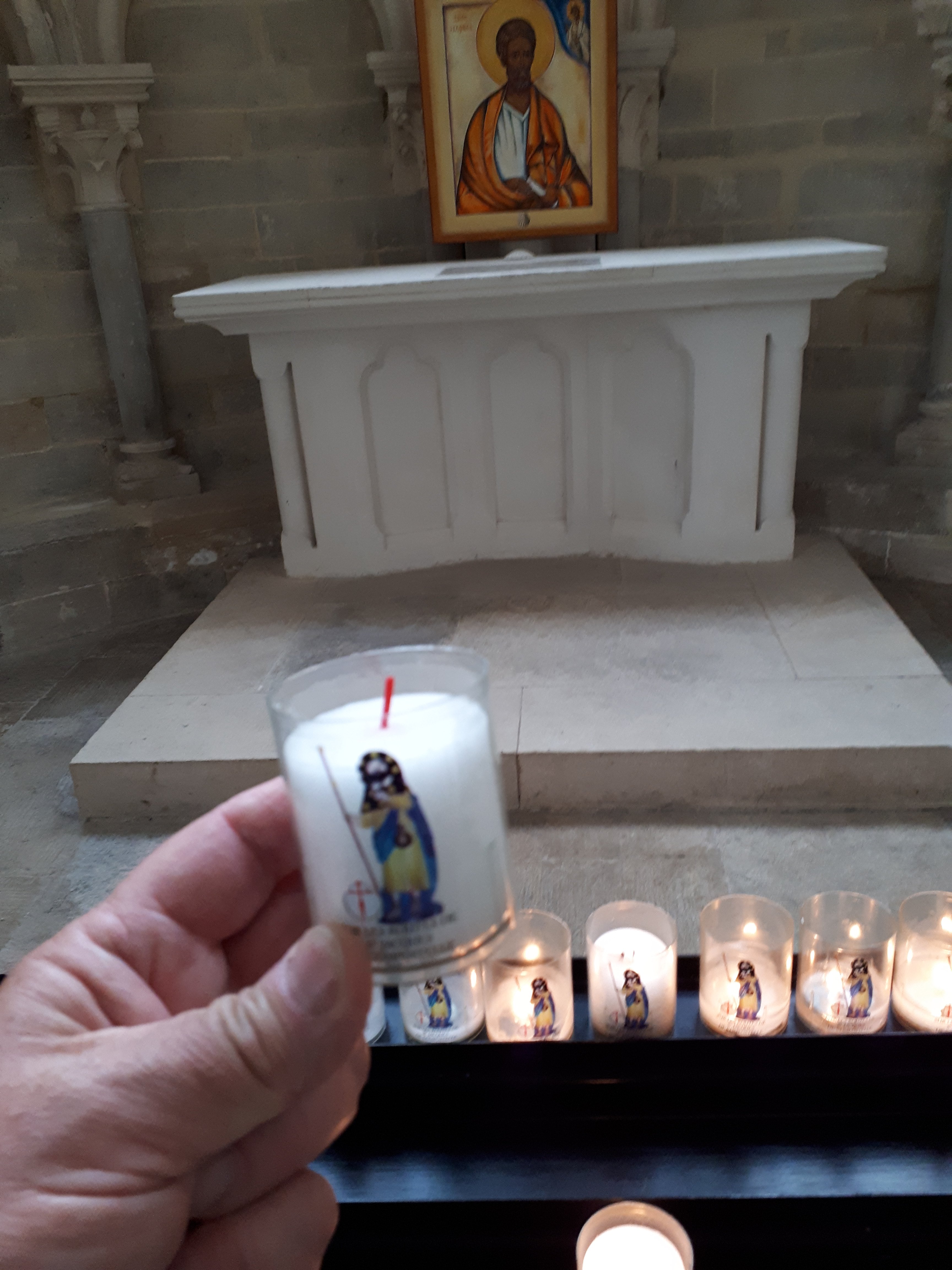 Zo zie je voor en na. Bijna reclame voor Dash. Vandaag was het naamdag van apostelen Filipus én Jacques ofte Jacobus. De pelgrimheilige. Dus toch een kaarsje gebrand omdat ik bijna een vierde van de Camino zonder ongelukken heb afgelegd en voor behouden verder zetten. Het kan maar helpen.