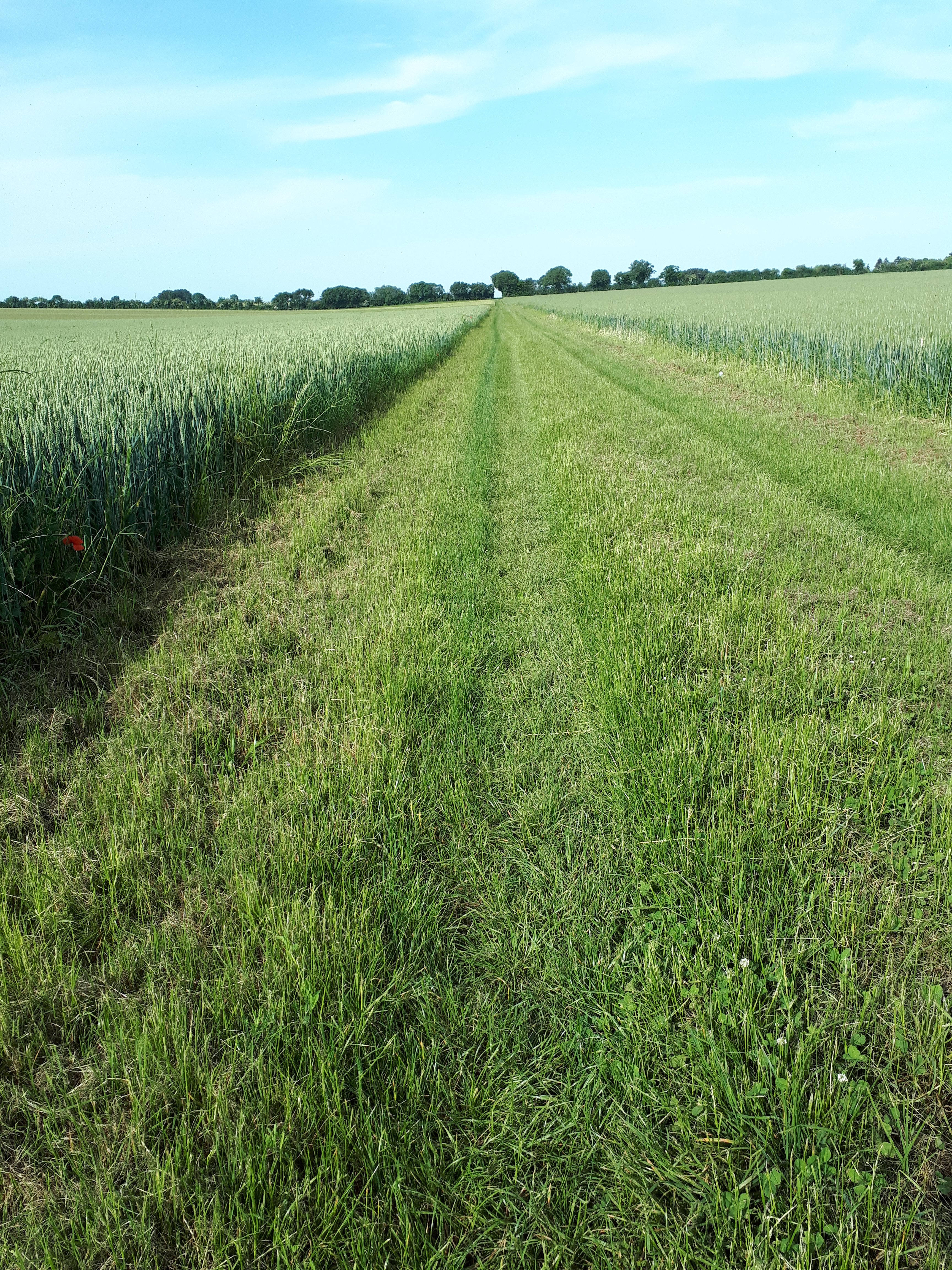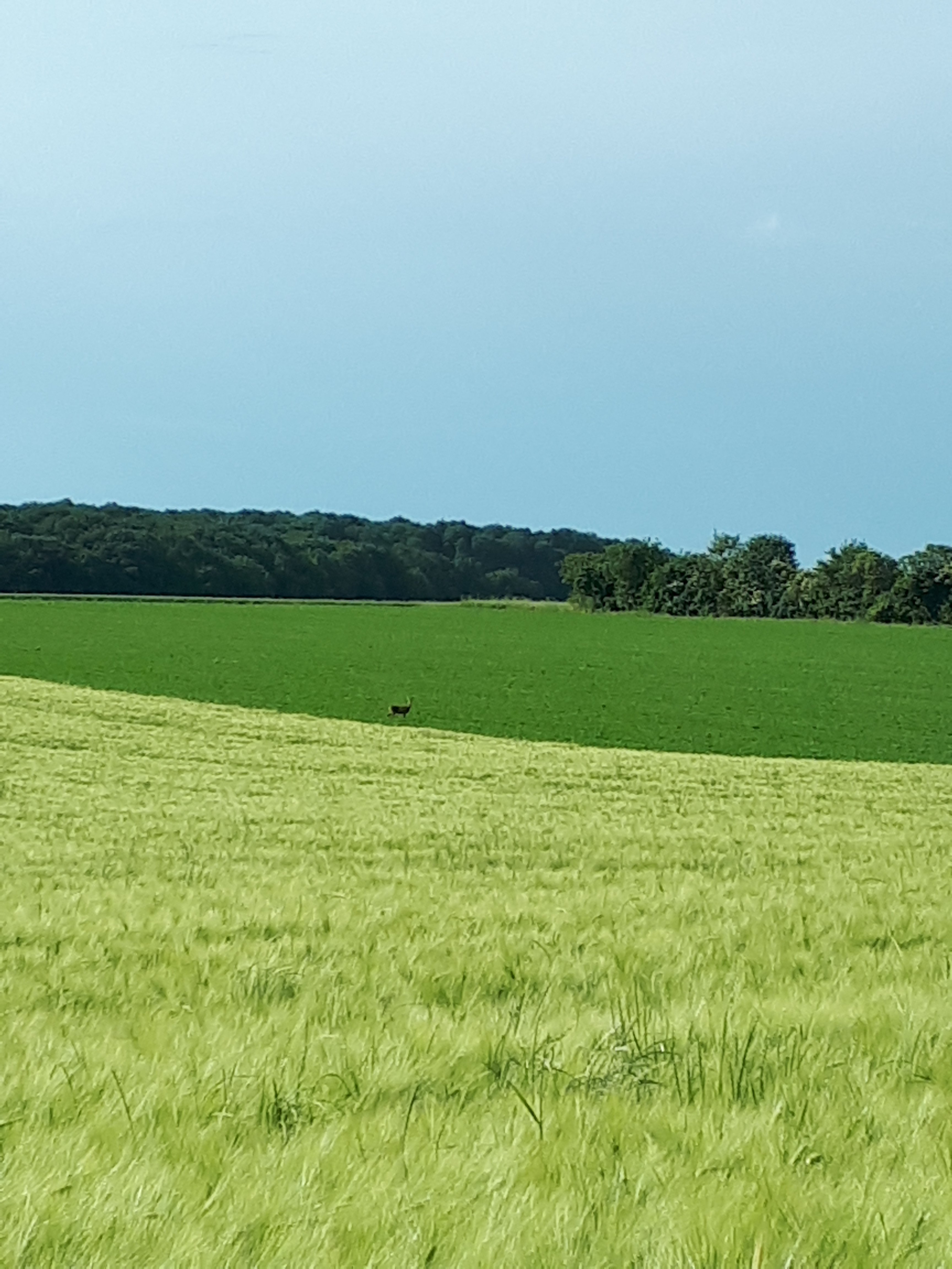 Na een uitgebreid ontbijt in La fauconiere met een koppel Fransen en Australiërs terug de rugzak opgetild en vertrokken. Vandaag geen bossen maar akkers. En daar tussen Een groen strook waar je over moet.