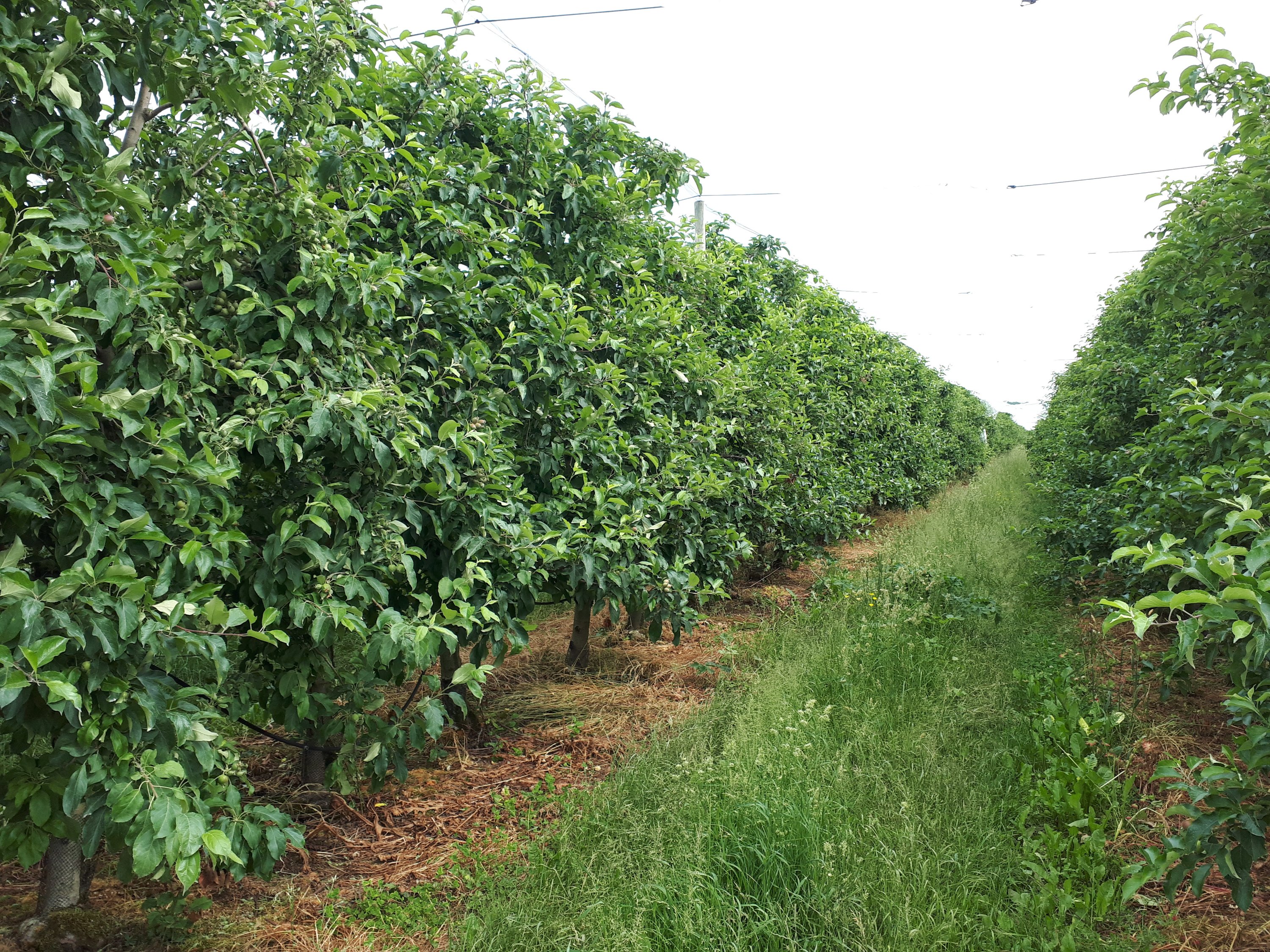 Buiten velden met gerst of maïs toch iets anders te melden. Boven op een heuvel een grote onderneming met veel appelbomen. Nog in knop natuurlijk. En dan volgen opnieuw de akkers.