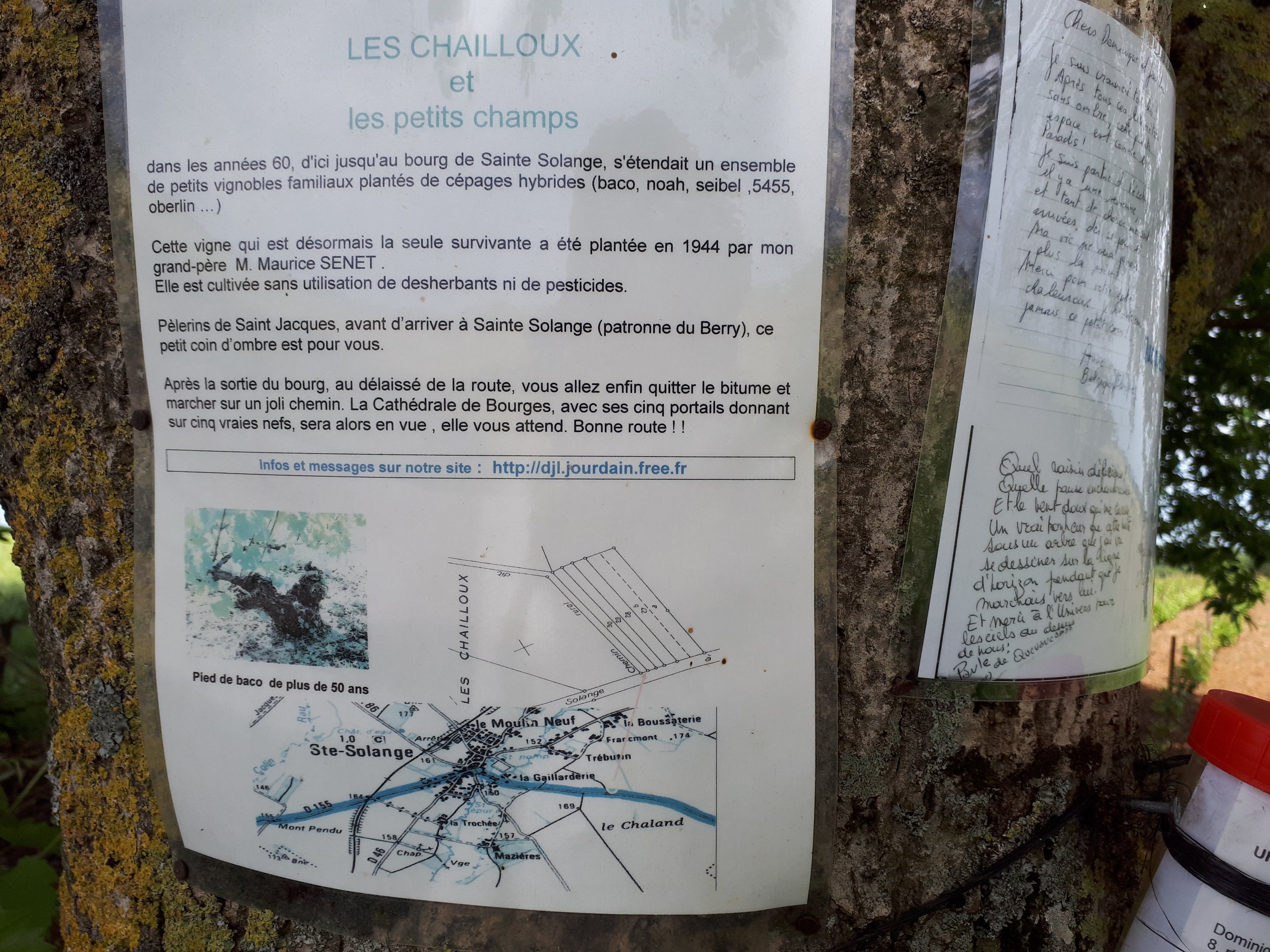 Hier en daar zijn er verwijzingen naar Compostela gangers. Een bank met een papier op dat je uitgenodigd wordt om te gaan zitten om wat uit te rusten. Car la route est encore longue. Of een kraan waar je drinkbaar water mag nemen, ook voorzien van de schelp. En dan komt het moment dat je in de verte de torens ziet van Vezelay.