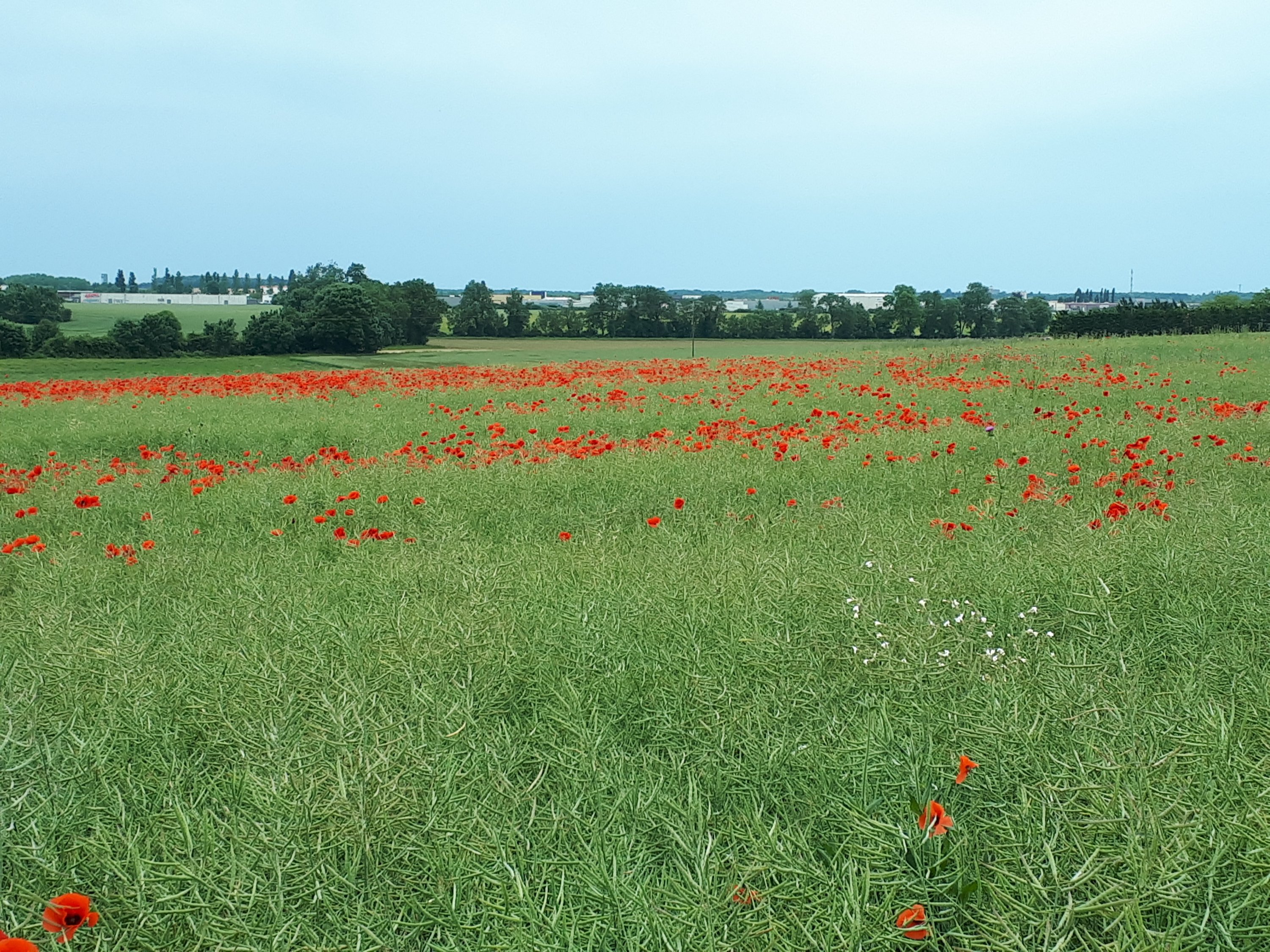 Er volgen stukken rustige departementale tussen jonge zonnebloemscheuten en graanvelden. De zonnebloemplantjes zijn nog heel klein. Wat verderop een schitterend korenveld gezien vol klaprozen en blauwe korenbloemen. Heel mooi. Zal wel een bio veld geweest zijn.