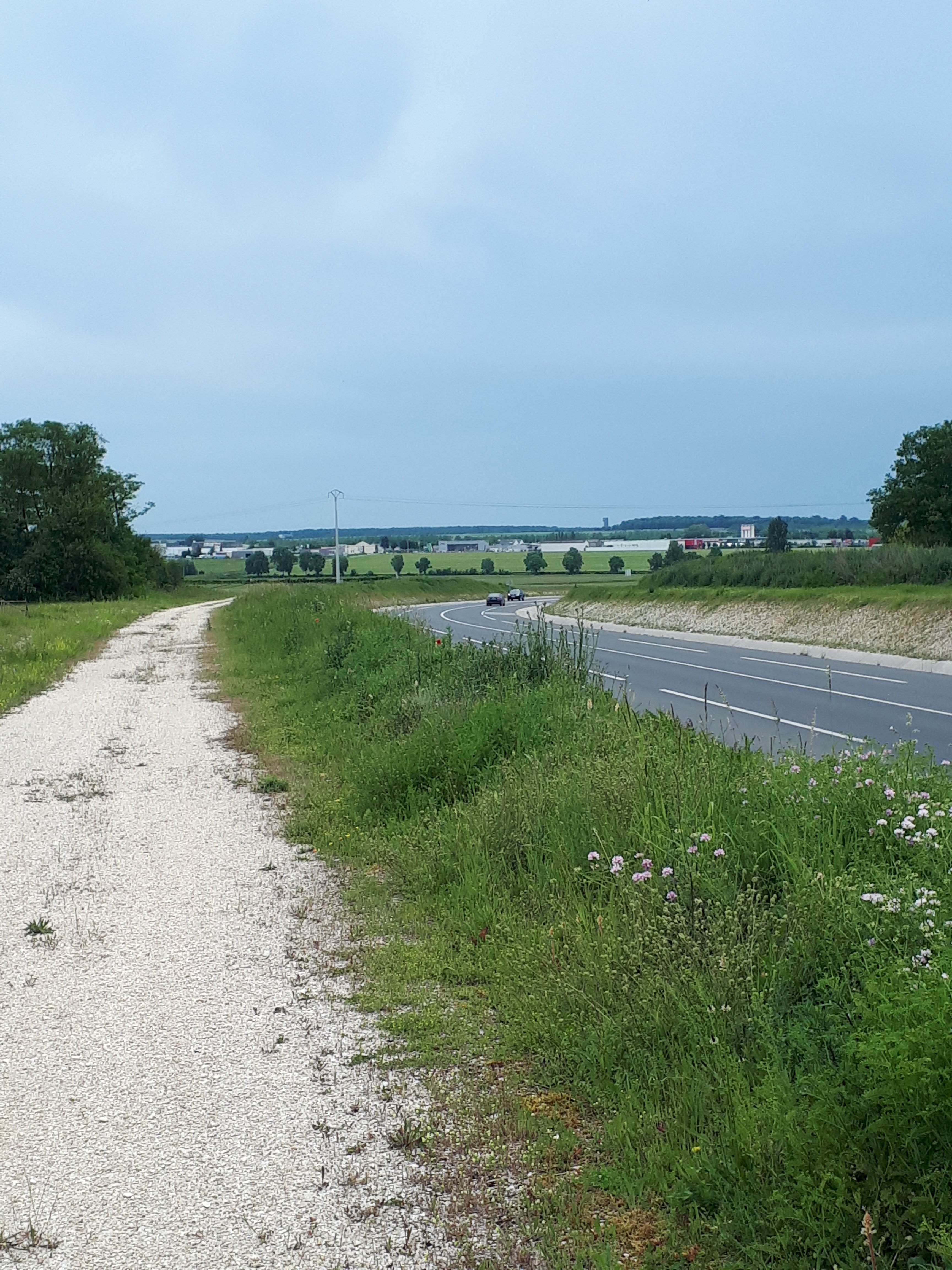 En zo naderde Bourges heel langzaam. Maar er kwam nog een verrassing! De lijnrechte Romeinse steenweg werd plots onderbroken door een nieuwe ringweg voor autoverkeer. Maar ipv een voetgangersbrug te hebben aangelegd moest deze vermoeide pelgrim (En alle andere pelgrims) zo een 800 m lopen naar de brug verderop en dan 800m terug stappen om de weg verder te zetten. Echt balen is dat.