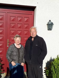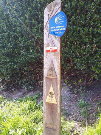 Wat verderop zag ik een rugzak met schelp! De 2 Fransen die ik gisteren even had ontmoet waren ook toegekomen. Even dag gezegd en hen verteld dat ze de stempel voor hun boekje in de pastorij moesten halen. Daar trokken ze meteen naar toe. In de stad nog wat rondgekeken en toch huizen zien staan die de wetten van de fysica aan hun hiel lappen.