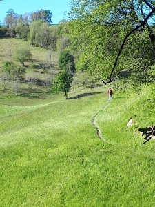 De tocht trekt de valei in langs glooiene graspaden. Af en toe wordt er even gepraat, maar vooral hard gestapt. Vreemd dat men al snel de pelgrims volgt… en volgt op het verkeerde pad. Want plots gaat de weg stevig omhoog en ik moet mijn collega’s lossen tijdens de klim. Tot na een tiental minuten er een tetugkeert met de melding dat we fout zitten. In het terugkeren komen we er nog 8-tal pelgrims tegen die ook mogen omkeren!
