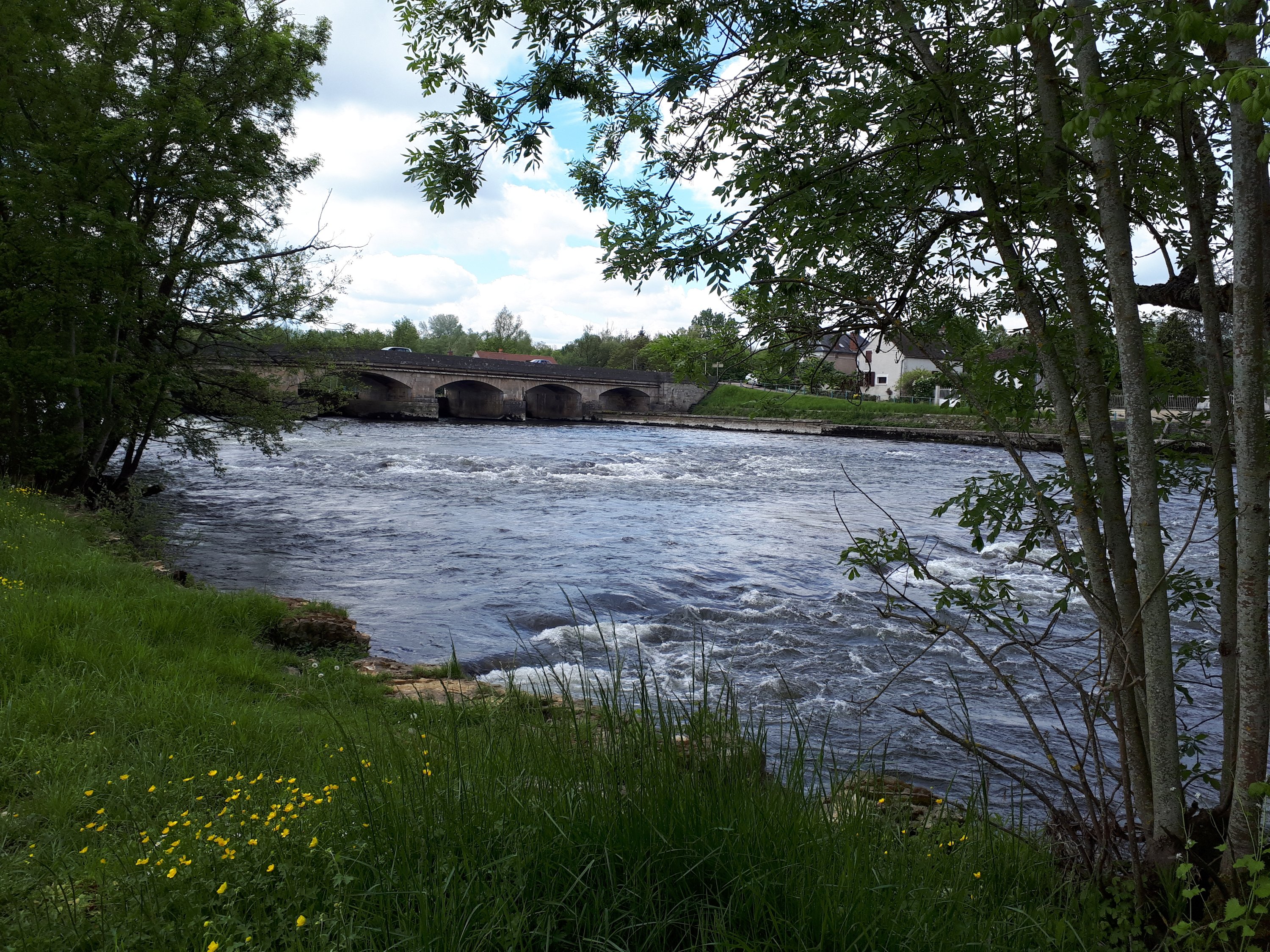 De streek werd gisteren terug heuvelachtiger en vandaag zou het nog erger worden. Maar vooraleer de tocht aan te vatten kocht ik eerst de treintickets om vrijdag naar huis terug te rijden. Na het bezoek aan het station verliet ik Ortez over de nieuwe autobrug en zo kon ik een foto maken van de oude brug met ongelijke bogen.