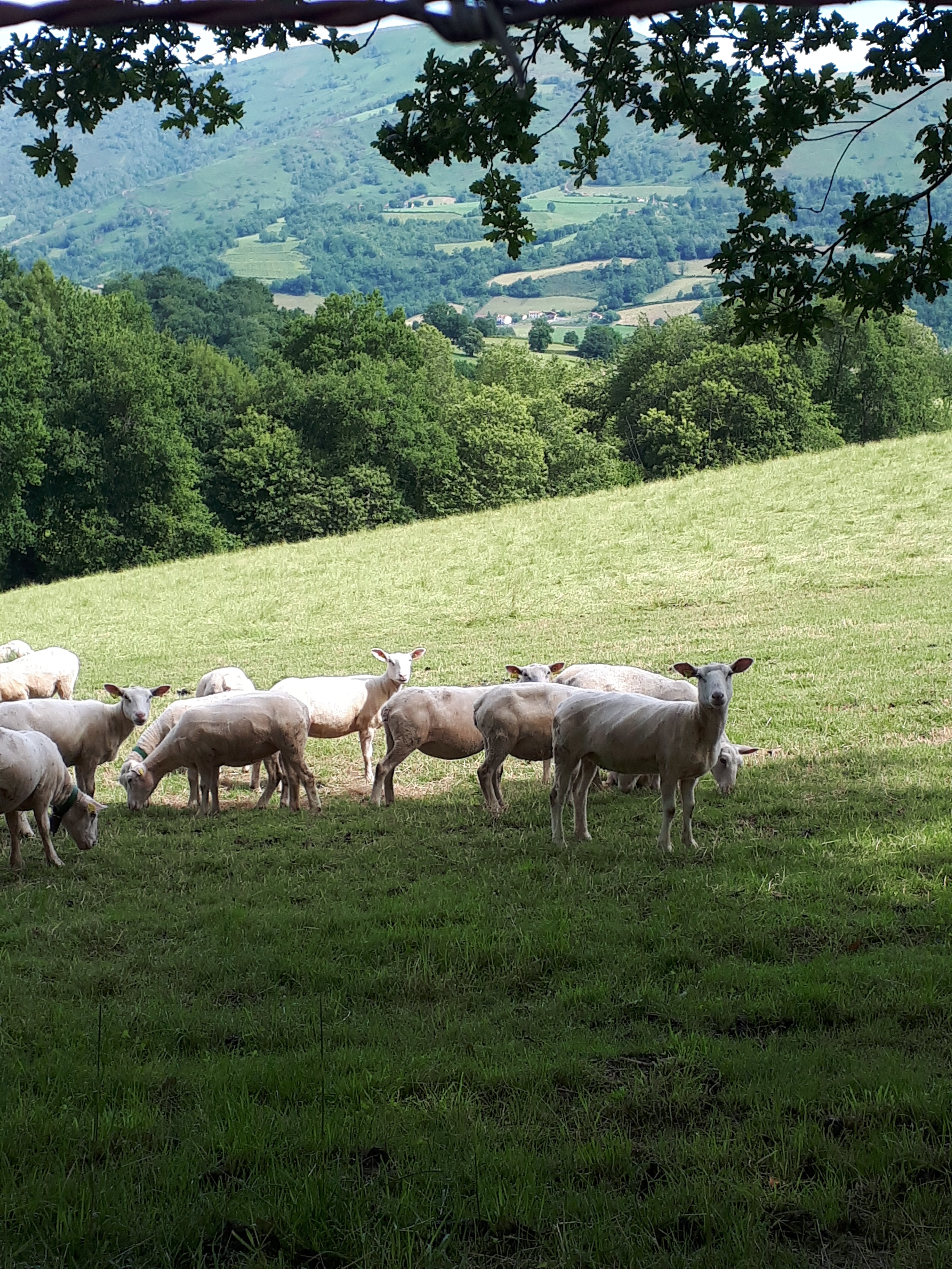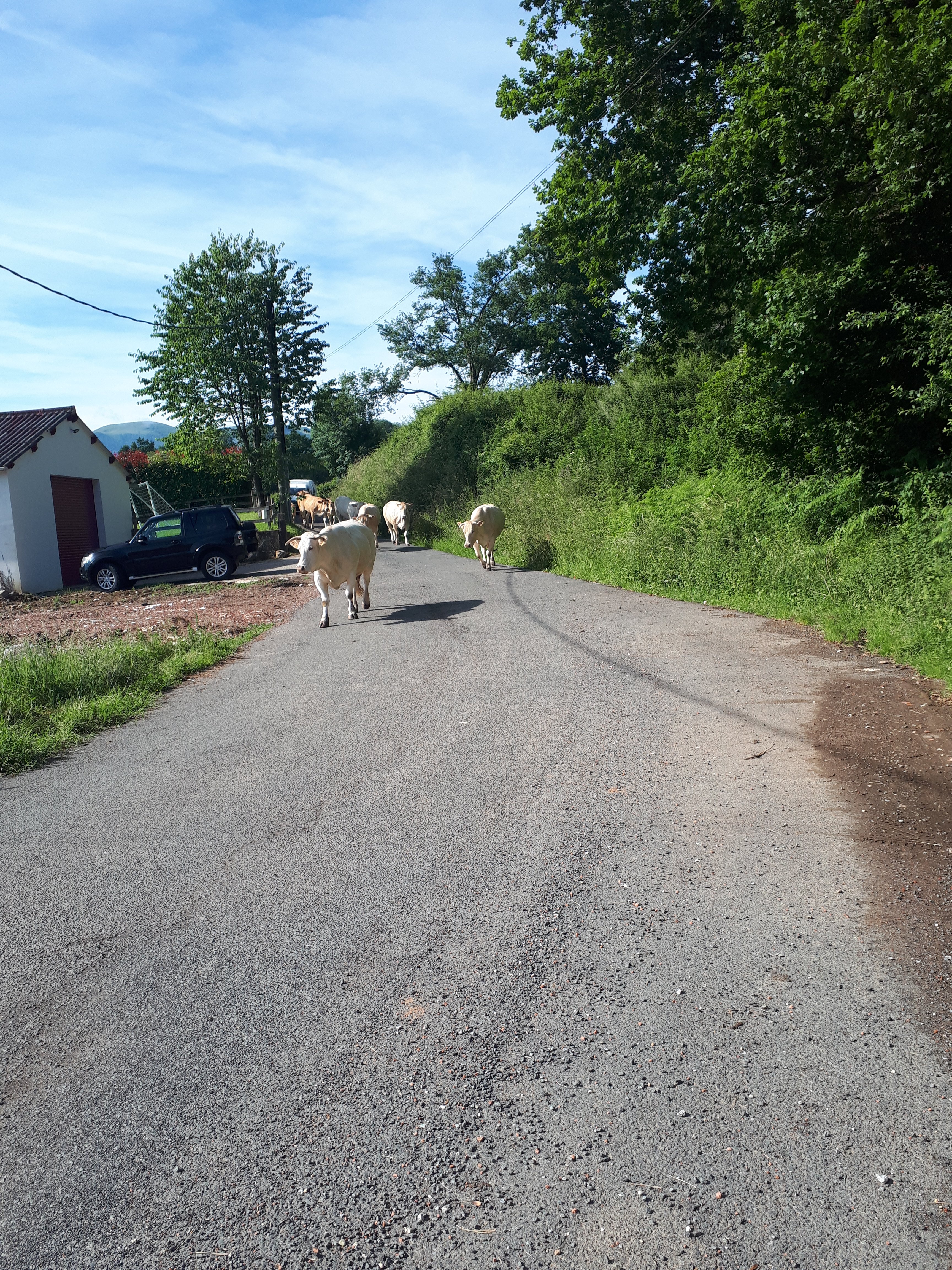 Het bleef droog. De temperatuur rond de 15 graden. De wegjes waren goed begaanbaar. Tot de middag, tot in Guemes e vervolgens Galizano ging het op en neer tussen weiden, koeien en geiten, boerderijen en bossen van eucalyptus. Een pelgrim (ik vermoed een Nederlandse naam gelezen te hebben op het naamplaatje van de rugzak) stond te communiceren met de koeien toen een groep fietsers hem voorbijschoot.