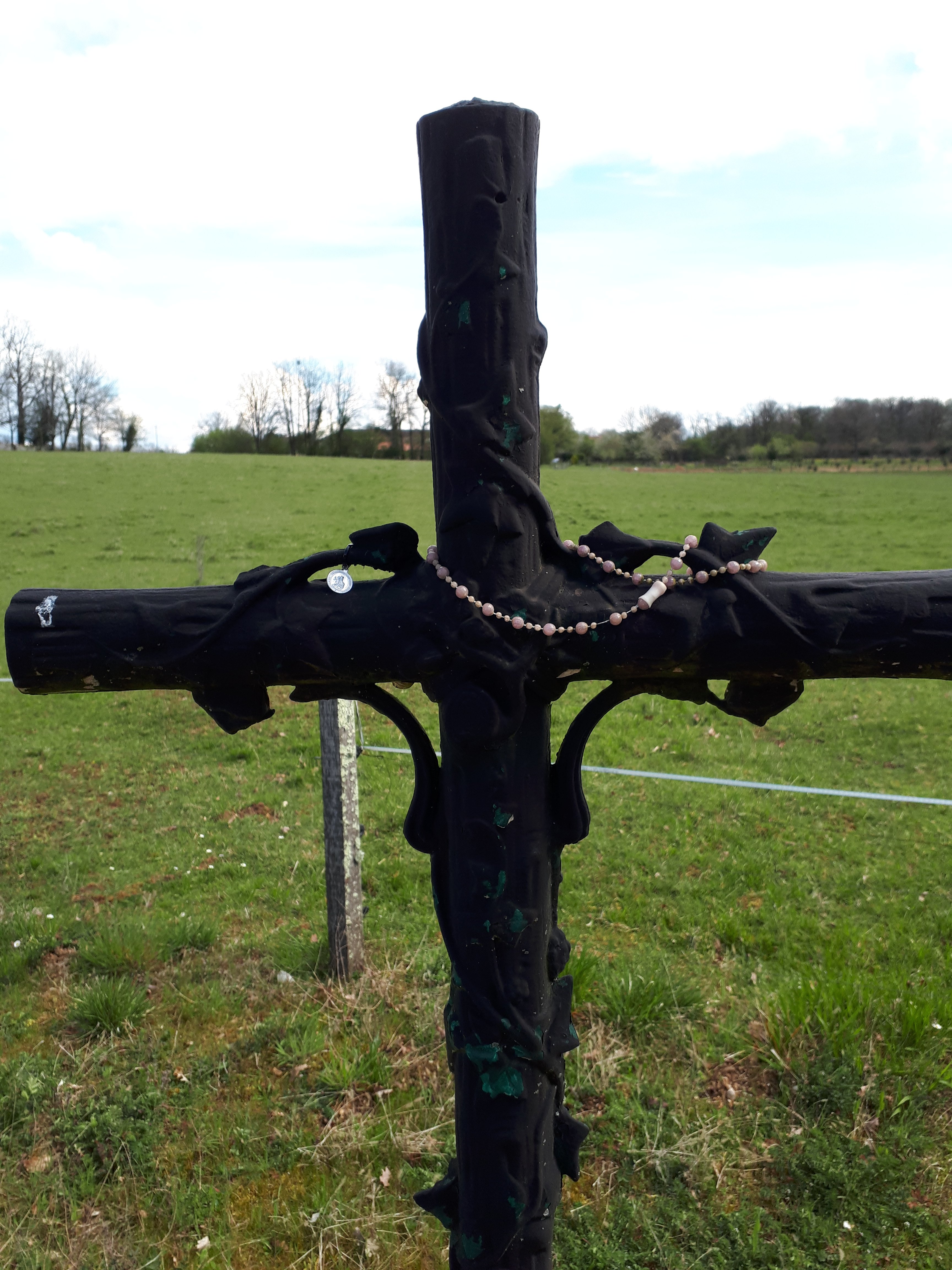 Af en toe staan er kruisen langs de weg. De meeste zijn uitgehouwen uit steen, sommige zijn in gietijzer. Dit exemplaar is zwart geverd en iemand had er een rozenkrans aan gehangen.