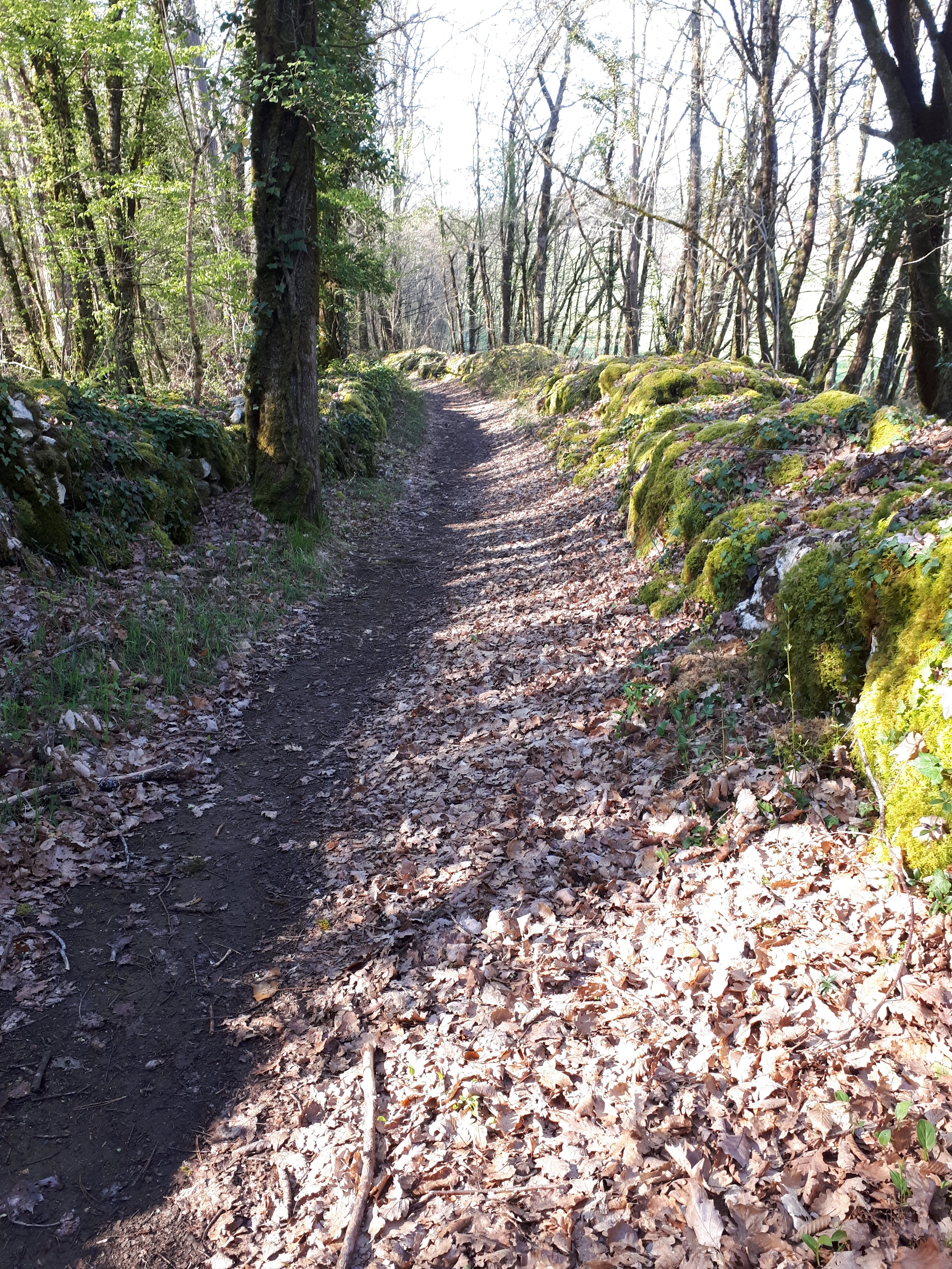 Muren langs het wandelpad, muren opgetrokken uit kalkblokken en overgroeid met een dikke moslaag en dat kilometerslang. Eigenaardig.