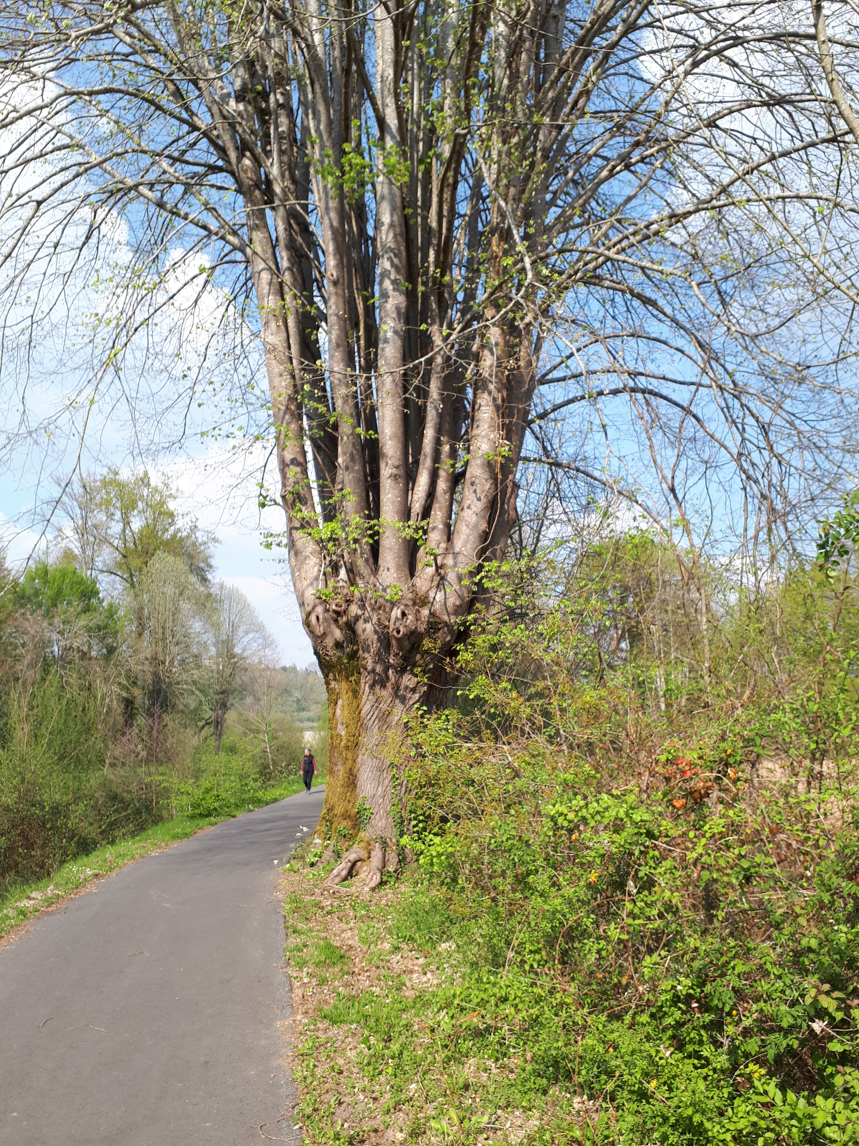Prachtige oude eiken kom je ook tegen. Heel majestueus bieden ze een flink pak schaduw tijdens deze warme lentedagen. Via het nieuws hoor ik dat heel Frankrijk en België kreunen onder de hitte, maar hier valt het goed mee.