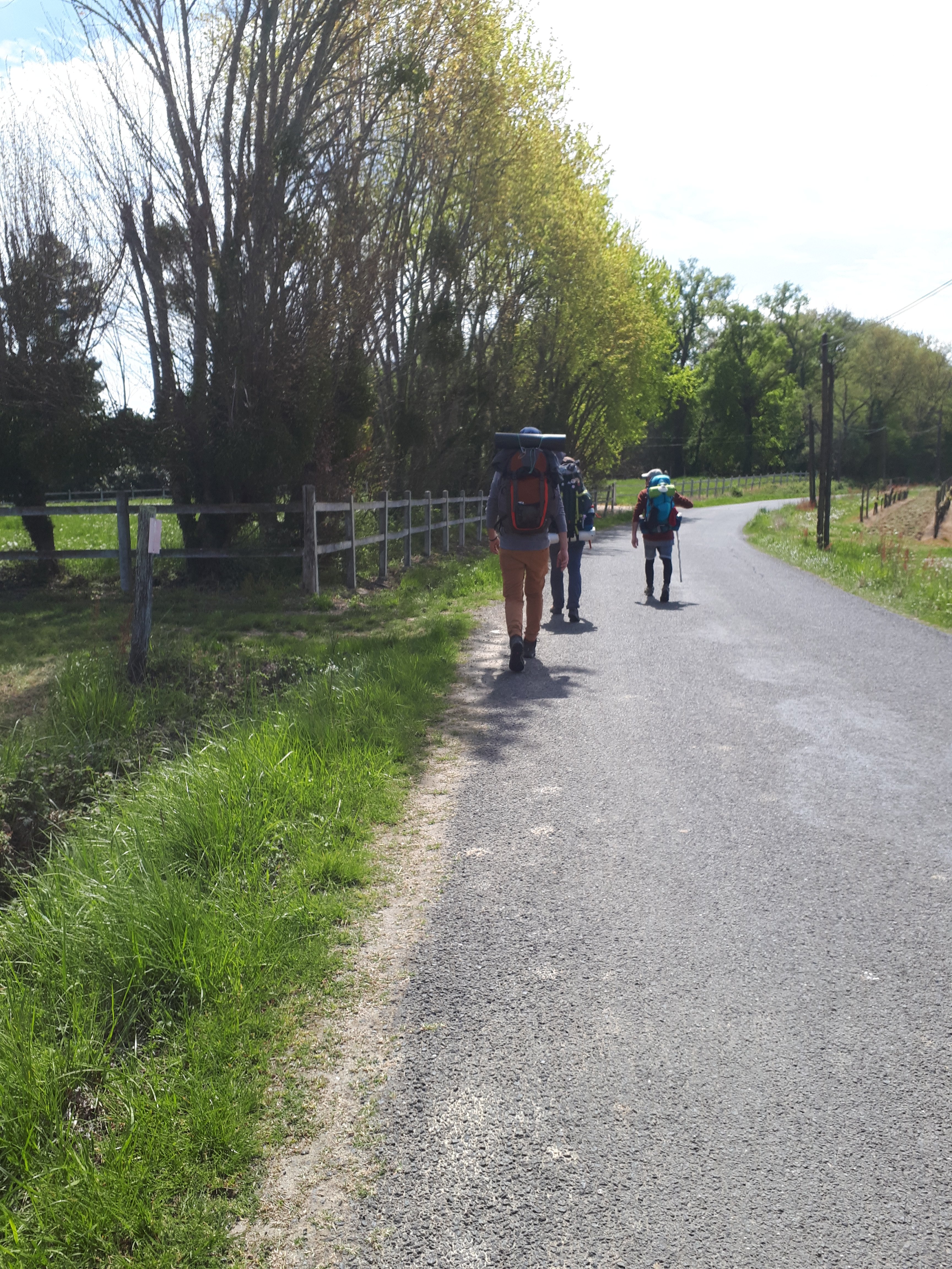 Bij een uitgebrande hoeve kwam ik plots 3 jonge pelgrims tegen. Fransen op stap naar Compostela. Ze zagen er wat verfromaaid uit en wat verderop haalden ze me in.