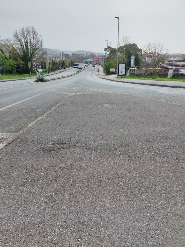 Telkens moet je je voeten rond die bevestiging van de stootrand zwieren. Comfortabel is anders. En de wagens scheuren voorbij. Daar ook de Parijzenaar terug ontmoet. Hij was verwonderd van mijn vooruitgang, maar was zelf naar Aviles gereden met de bus en had de dar ervoor wat gesurfd vertelde hij. Voorbij de brug ging het weer stevig omhoog en liet ik hem gaan.