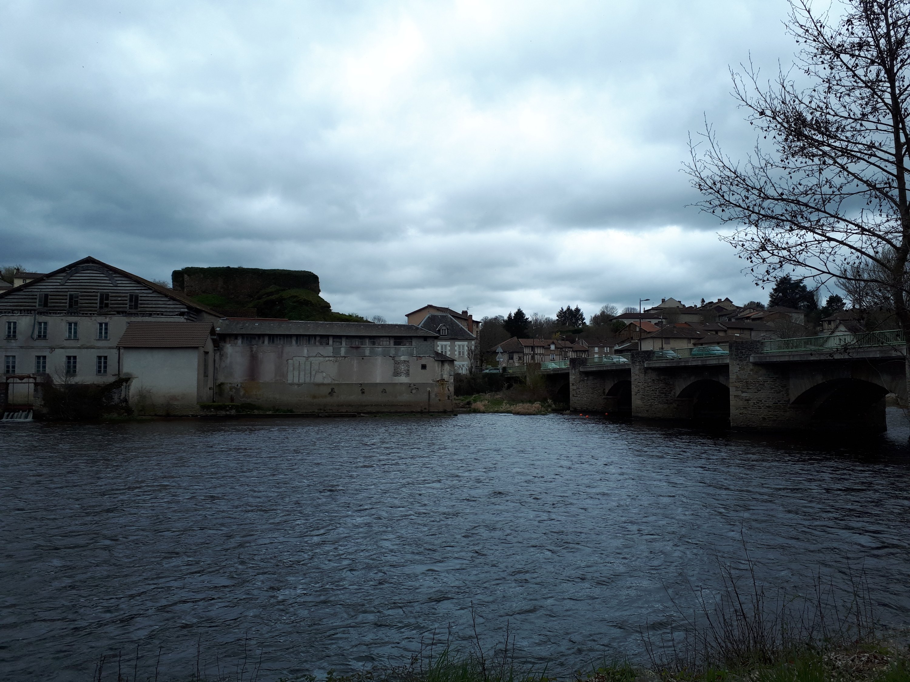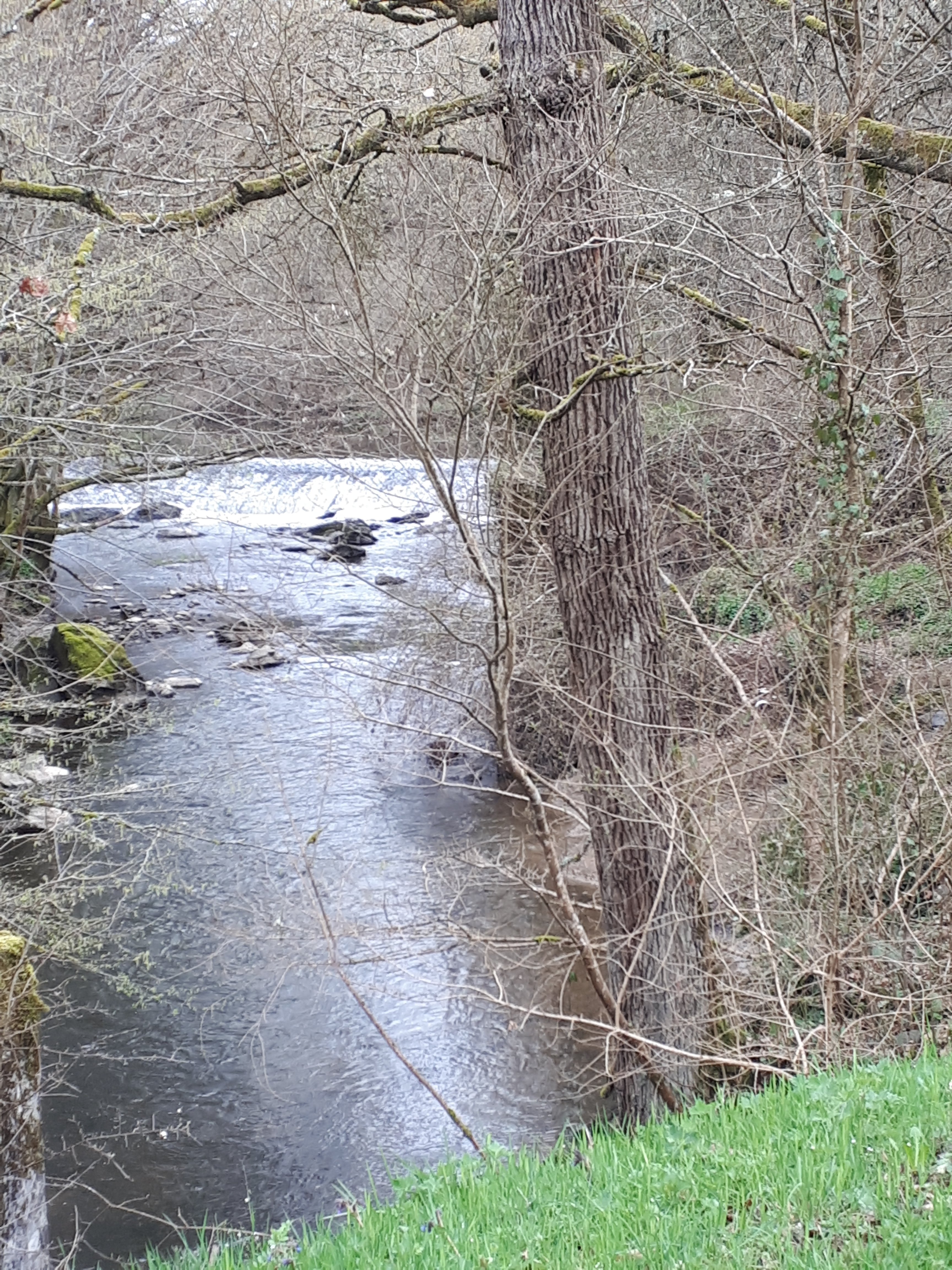 Nog wat naar beneden, een brugje over en wat verder stond ie dan. Camino wachter 10km rond. Met versleten schoenen. Op elke wachter ligt nu iets. Schoenen, keitjes, bloemen, enz