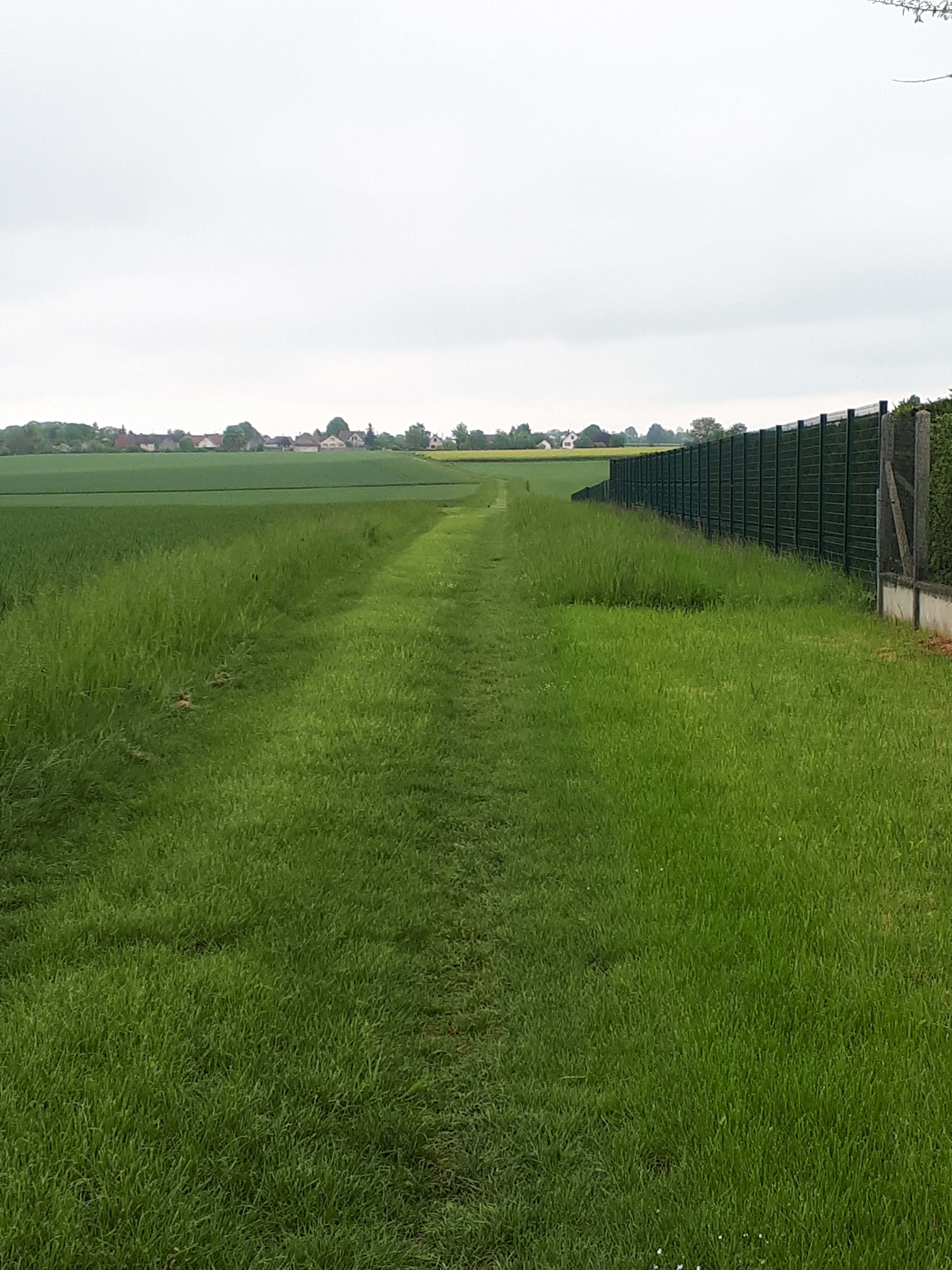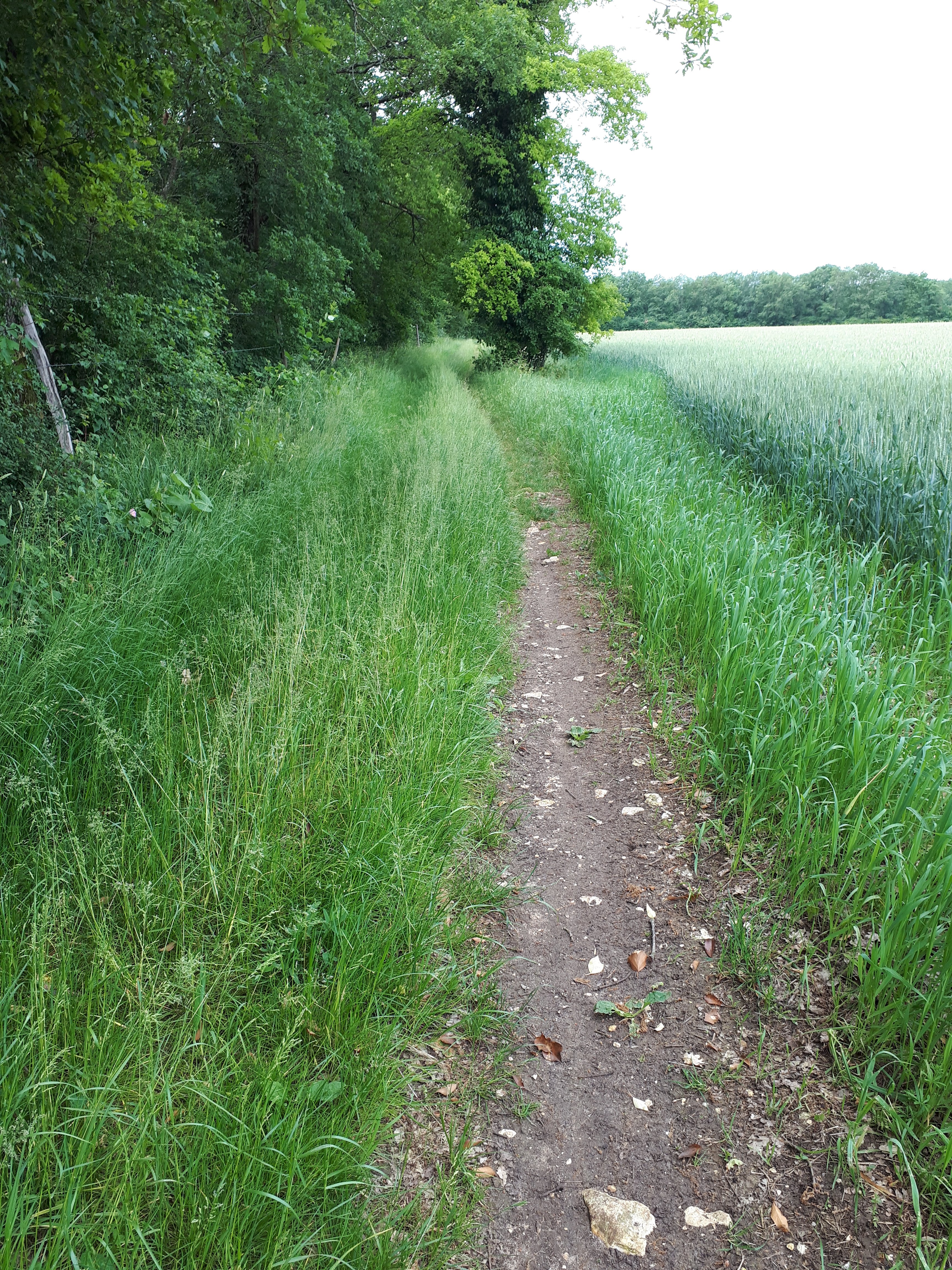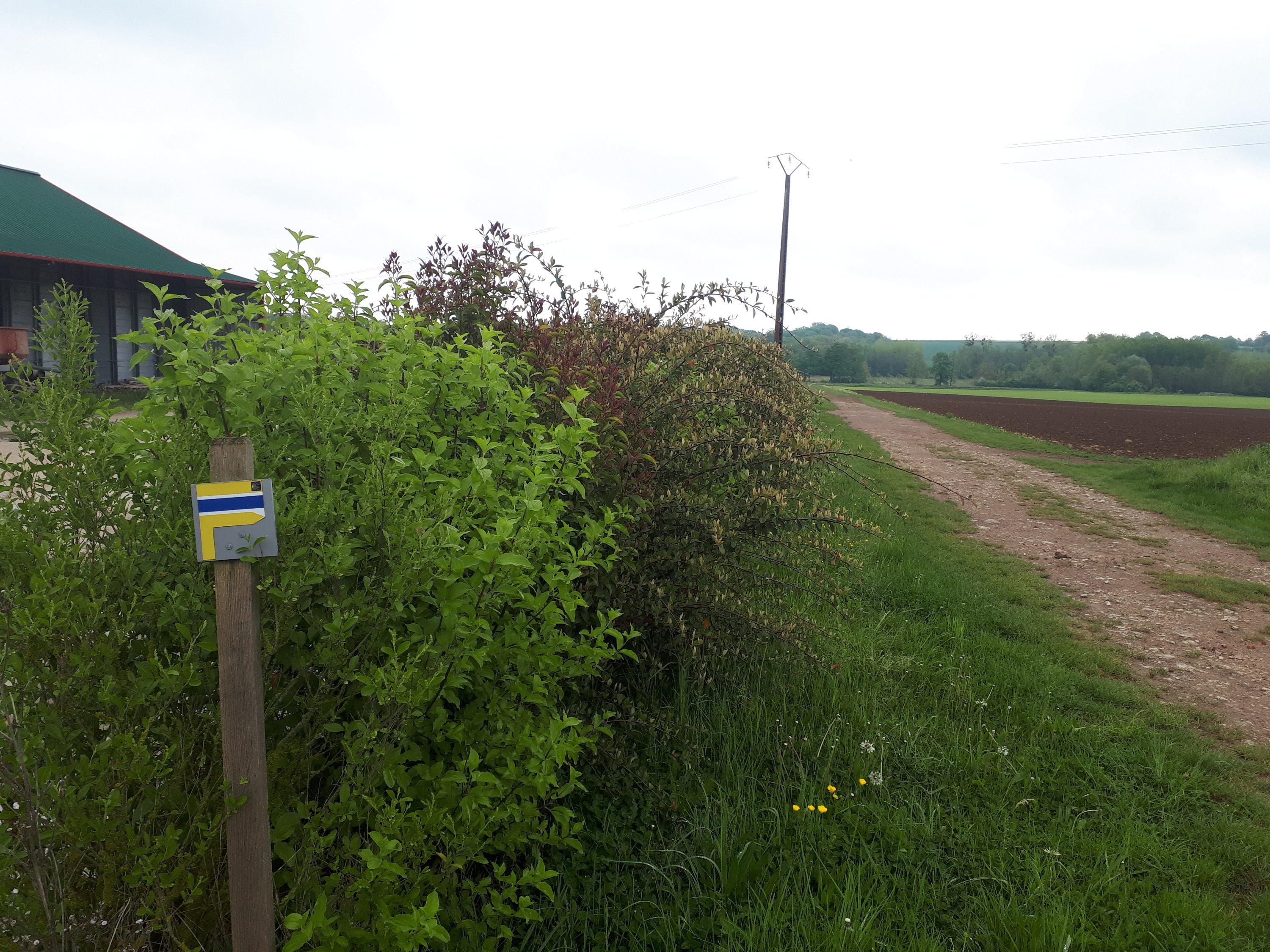 Na een uitgebreid ontbijt in La fauconiere met een koppel Fransen en Australiërs terug de rugzak opgetild en vertrokken. Vandaag geen bossen maar akkers. En daar tussen Een groen strook waar je over moet.
