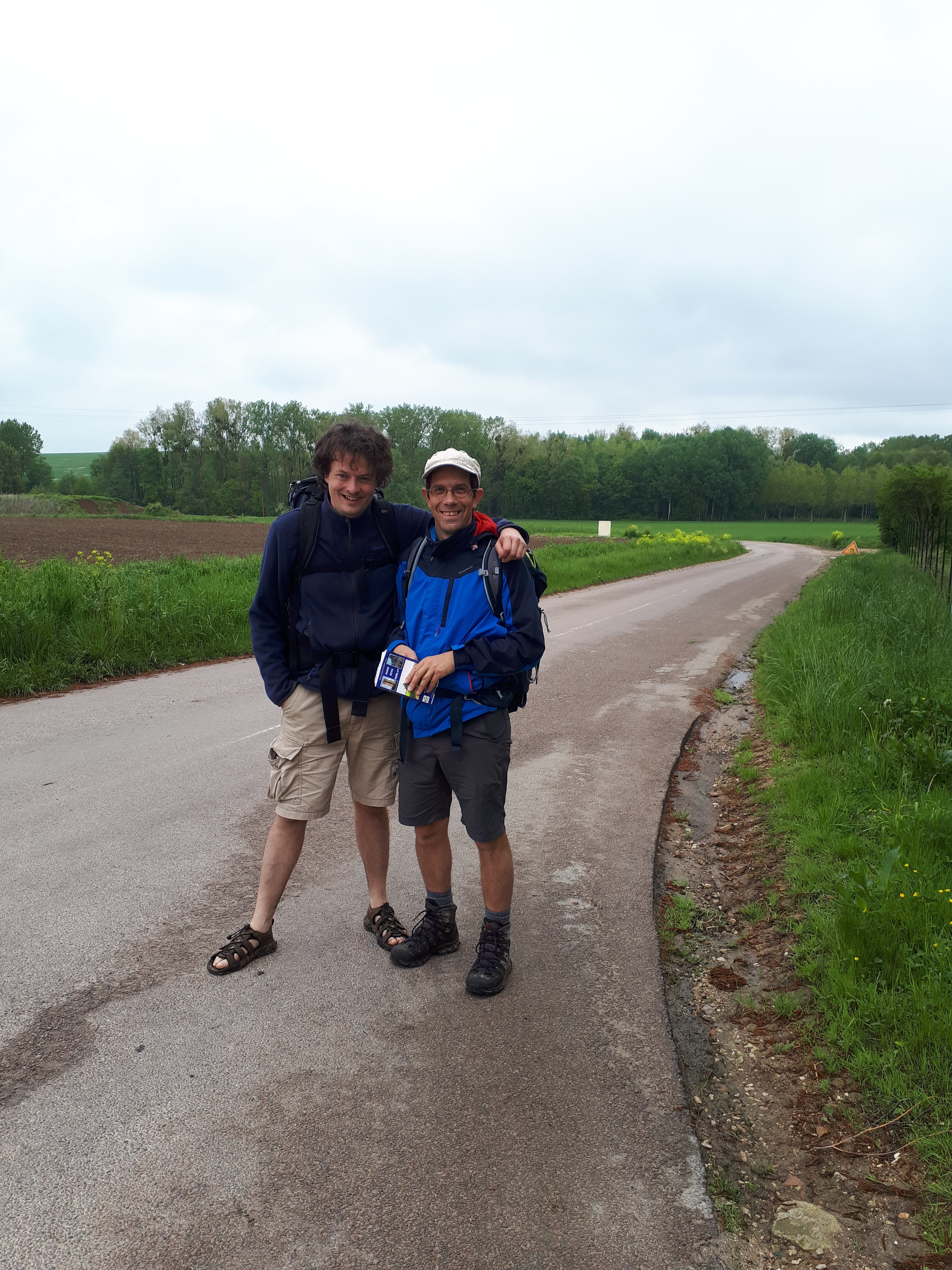 Want de juiste richting kiezen is wel belangrijk. Dat werd duidelijk bij de volgende ontmoeting. 2 mannen zwaaiden naar me. Ze hadden allebei rugzak en schelp. Er was een jonge kerel op sandalen en in korte broek en een wat oudere kerel die blijkbaar Wilfried heet en eigelijk uit nice naar Parijs is verhuisd. We maakten kennis. Ze waren thuis gestart in Parijs en stapten de Camino in vele stukjes. De eerste stroken gebruikten ze het openbaar vervoer en ’s avonds reden ze terug naar huis om te overnachten. Nu waren ze echt op stap met overnachting en ze wilden morgen Auxerre bereiken en terug reizen.