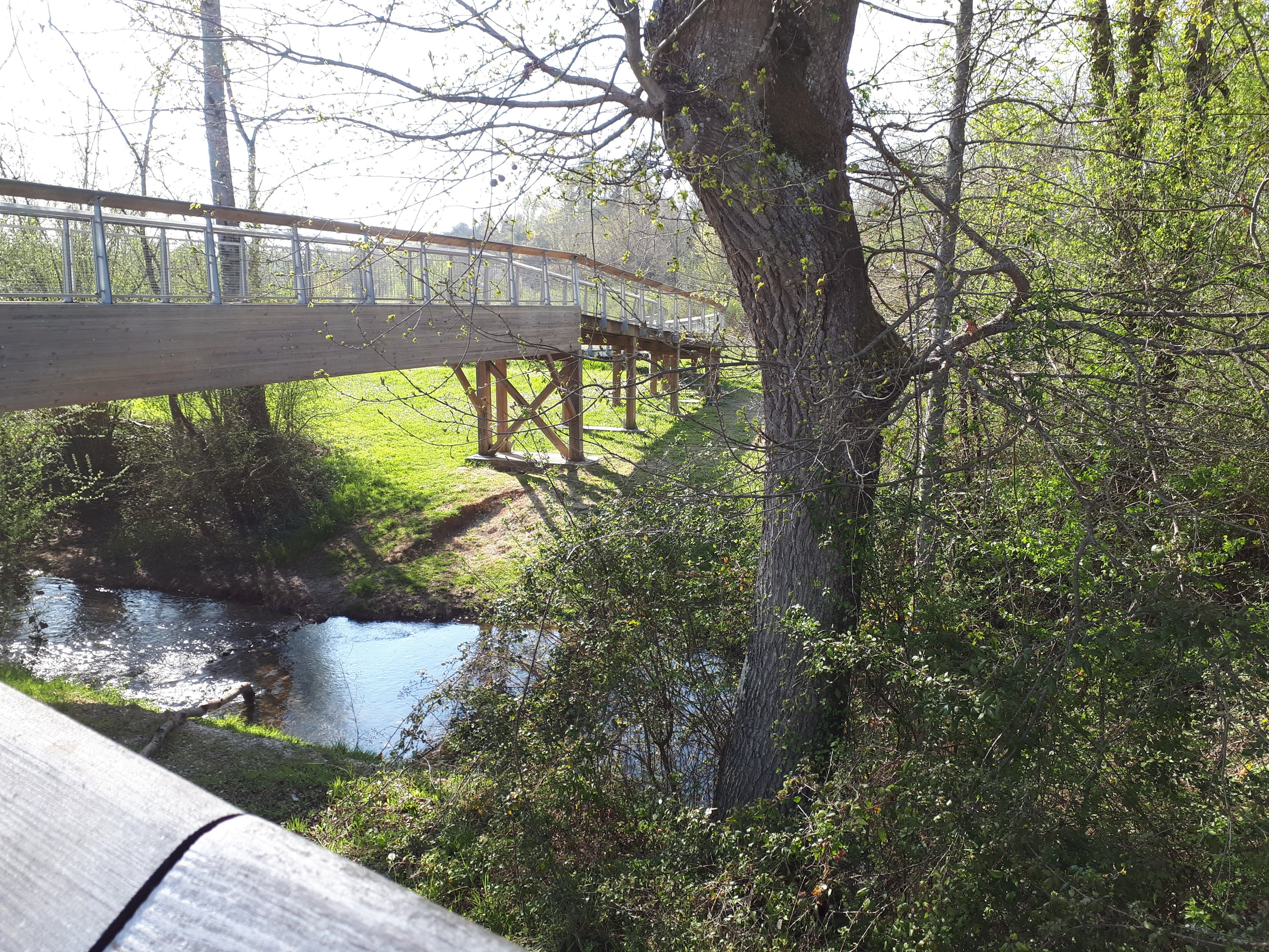 De weg is hier goed begaanbaar. Er werd hard gewerkt om pelgrims te laten stappen in veiligheid zoals deze spiksplinternieuwe brug toont.
