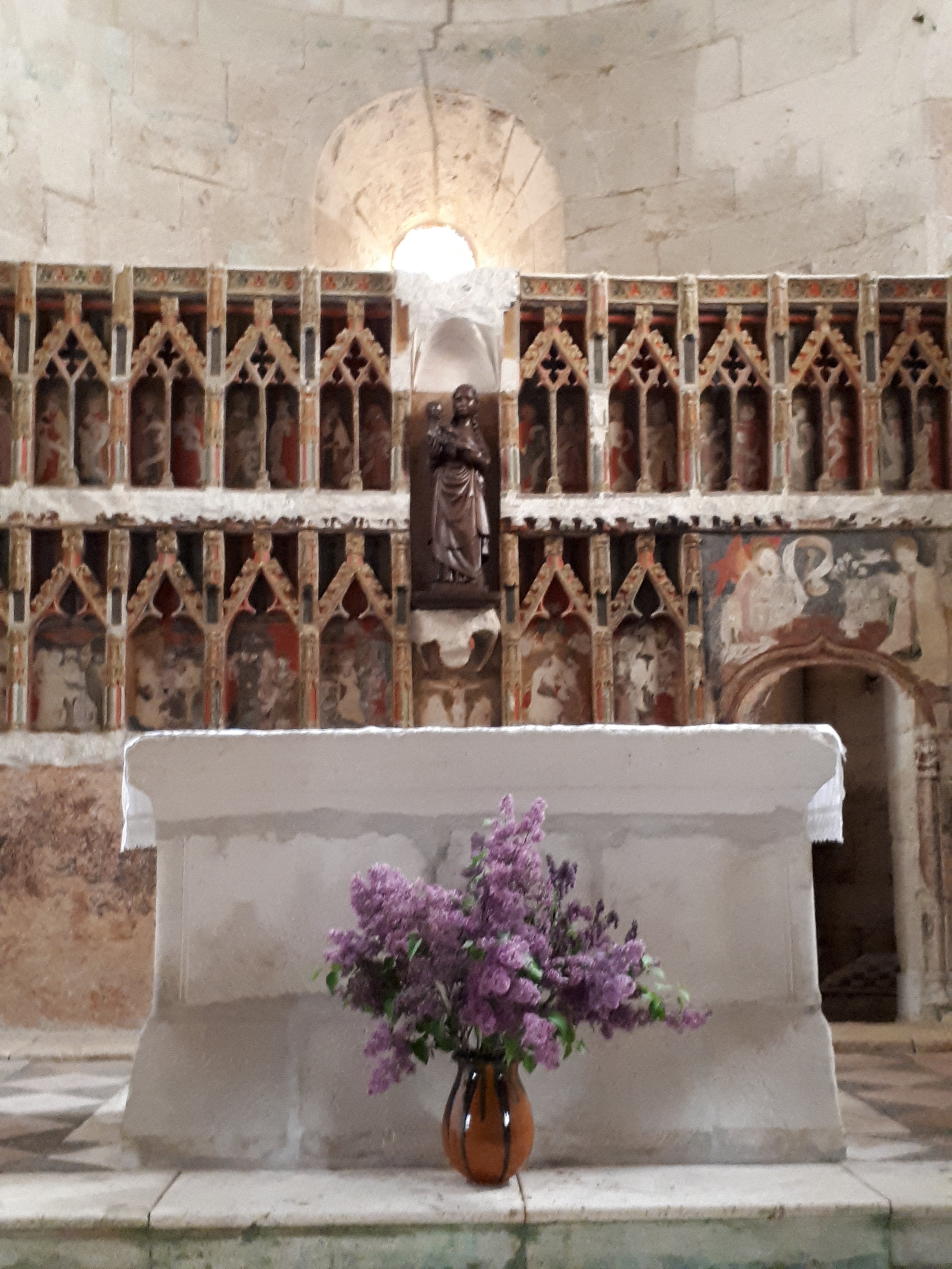 Volgende stille halte was Labastide-Chalosse. Weinig mensen, ook in de kerk. Maar wel mooi met vele oude beelden, zoals dit altaarstuk.