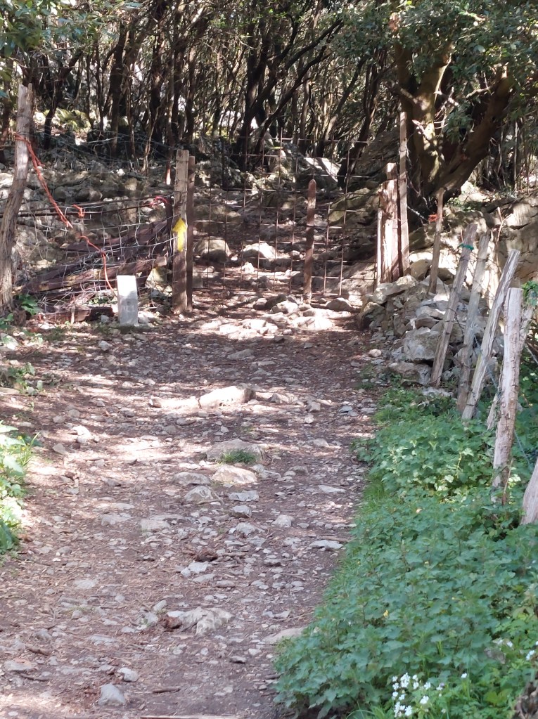 Het pad startte als bospad. Ik moet toegeven dat ik wat ongerust was, want noch kaart, noch beschrijving klopte met wat ik zag. Maar de dag was vroeg, de etappe niet zo vreselijk lang en de markeringen heel goed. Wat hogerop een ruïne.